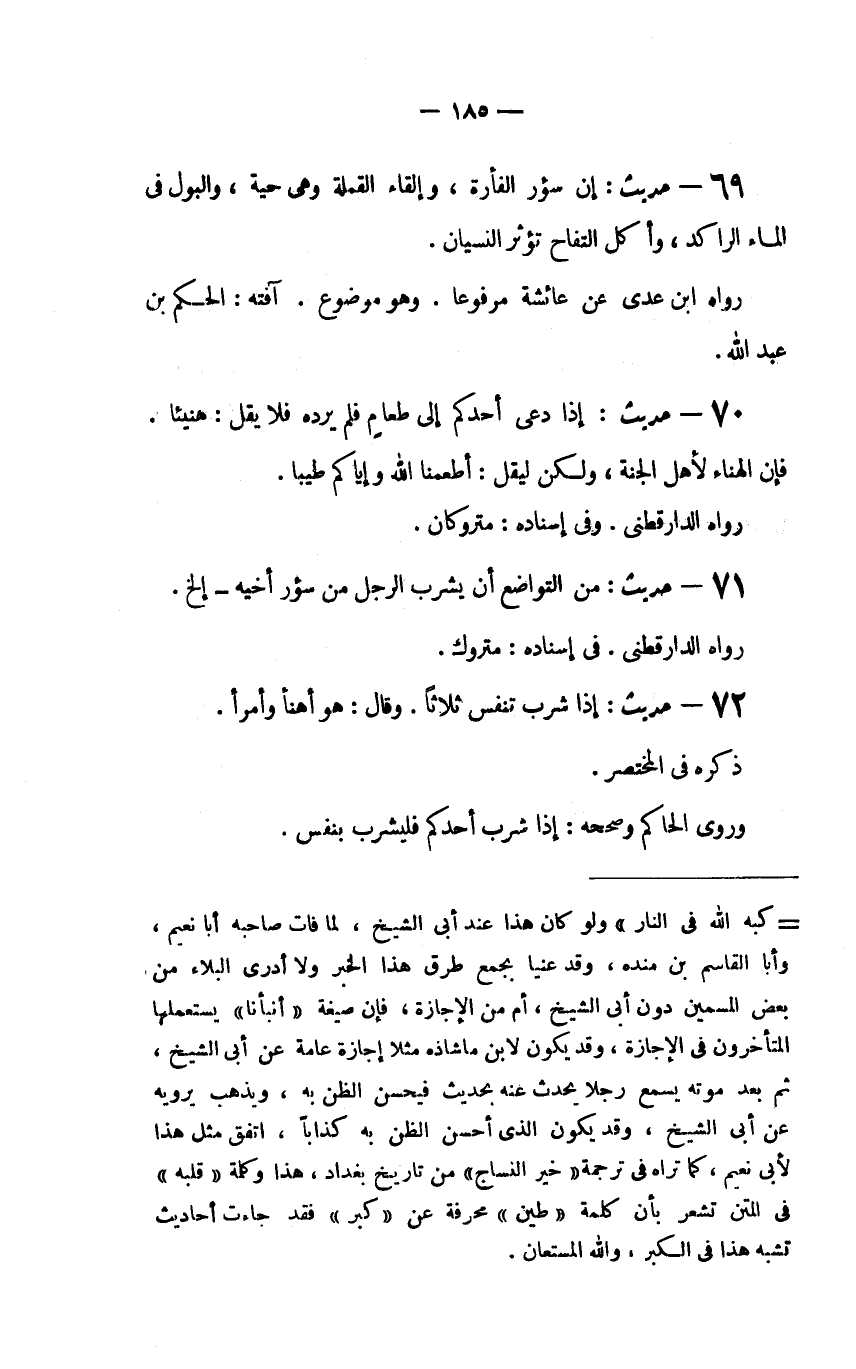 69 - حديث: "إِنَّ سُؤْرَ الْفَأْرَةِ وَإِلْقَاءَ الْقَمْلَةِ وَهِيَ حَيَّةٌ وَالْبَوْلَ فِي الْمَاءِ الرَّاكِدِ وَأَكْلَ التُّفَاحِ تُؤْثِرُ النِّسْيَانَ".