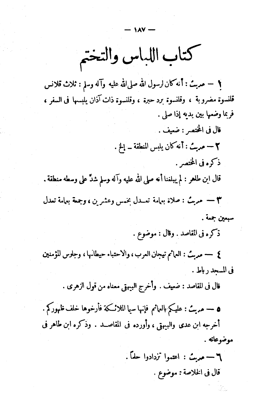 5 - حديث: "عَلَيْكُمْ بِالْعَمَائِمِ فَإِنَّهَا سِيمَا الْمَلائِكَةِ فَأَرْخُوهَا خَلْفَ ظُهُورِكُمْ.