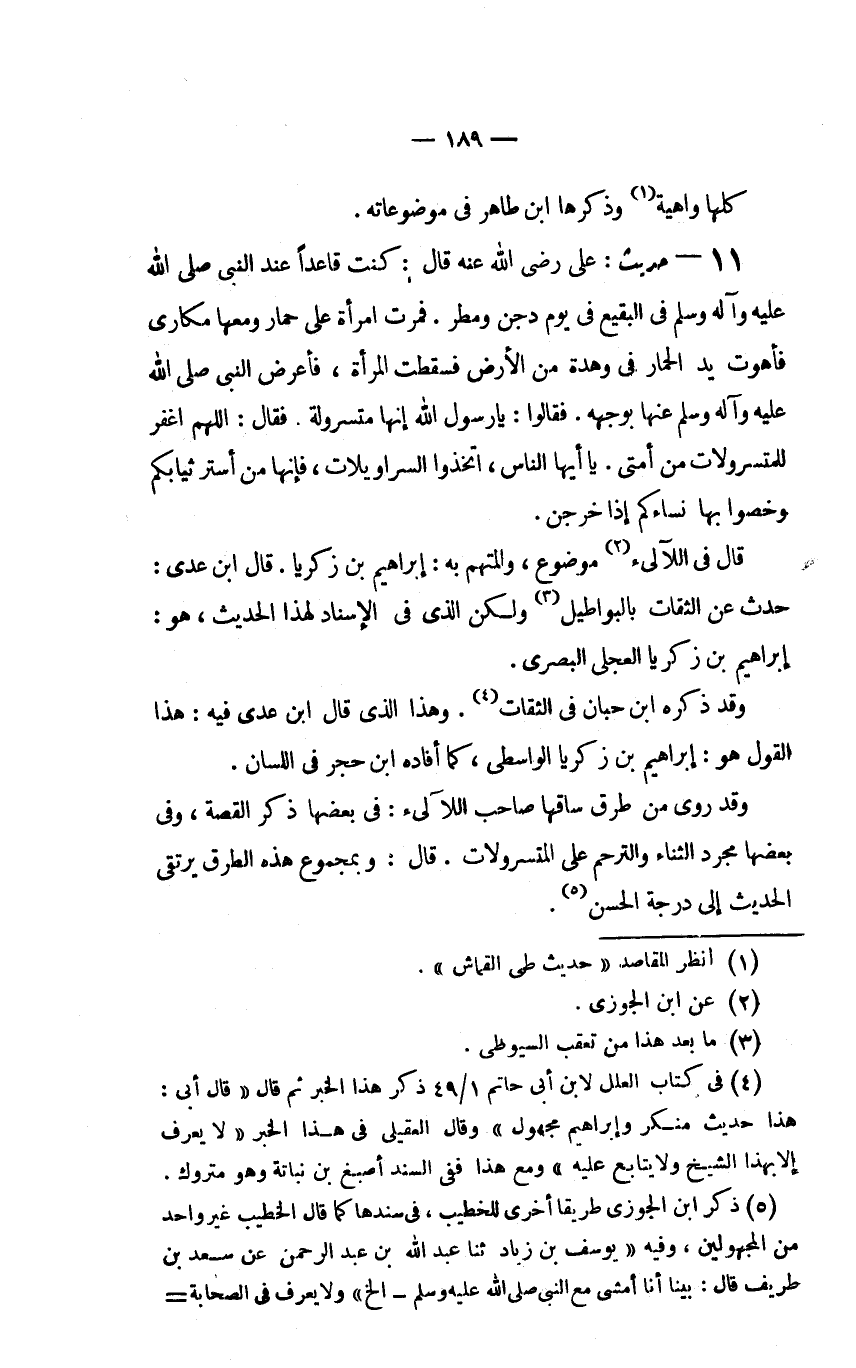 قَالَ في اللآلىء (2) مَوْضُوعٌ وَالْمُتَّهَمُ بِهِ: إِبْرَاهِيمُ بْنُ زَكَرِيَّا قَالَ ابْنُ عَدِيٍّ: حَدَّثَ عَنِ الثِّقَاتِ بِالْبَوَاطِيلِ (3) وَلَكِنَّ الَّذِي فِي الإِسْنَادِ لِهَذَا الْحَدِيثِ هُوَ: إِبْرَاهِيمُ بْنُ زَكَرِيَّا الْعِجْلِيُّ الْبَصْرِيُّ.