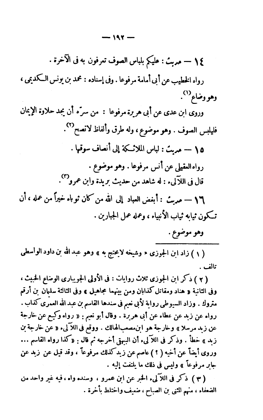 وَرَوَى ابْنُ عَدِيٍّ عَنْ أَبِي هُرَيْرَةَ مَرْفُوعًا: مَنْ سَرَّهُ أَنْ يَجِدَ حَلاوَةَ الإِيمَانِ فَلْيَلْبَسِ الصُّوفَ وَهُوَ مَوْضُوعٌ وَلَهُ طُرُقٌ وألفاظ لا تصح (2) .
