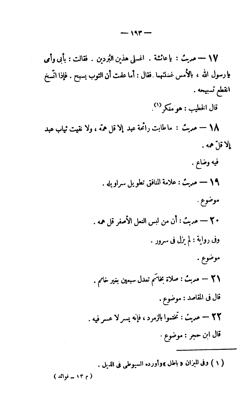 17 - حديث: "يَا عَائِشَةُ اغْسِلِي هَذَيْنِ الْبُرْدَيْنِ فَقَالَتْ: بِأَبِي وَأُمِّي يَا رَسُولَ اللَّهِ بِالأَمْسِ غَسَلْتُهُمَا فَقَالَ: أَمَا عَلِمْتِ أَنَّ الثَّوْبَ يُسَبِّحُ فَإِذَا اتَّسَخَ انْقَطَعَ تَسْبِيحُهُ.