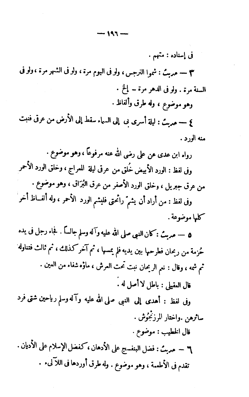 3 - حديث: "شُمُّوا النَّرْجِسَ وَلَوْ فِي الْيَوْمِ مَرَّةً وَلَوْ فِي الشَّهْرِ مَرَّةً وَلَوْ فِي السَّنَةِ مَرَّةً وَلَوْ فِي الدَّهْرِ مَرَّةً _ إلخ.