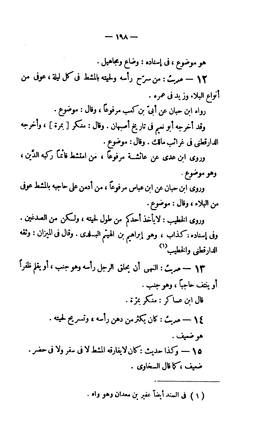 12 - حديث: "مَنْ سَرَّحَ رَأْسَهُ وَلِحْيَتَهُ بِالْمُشْطِ فِي كُلِّ لَيْلَةٍ عُوفِيَ مِنْ أَنْوَاعِ الْبَلاءِ وَزِيدَ فِي عُمْرِهِ".