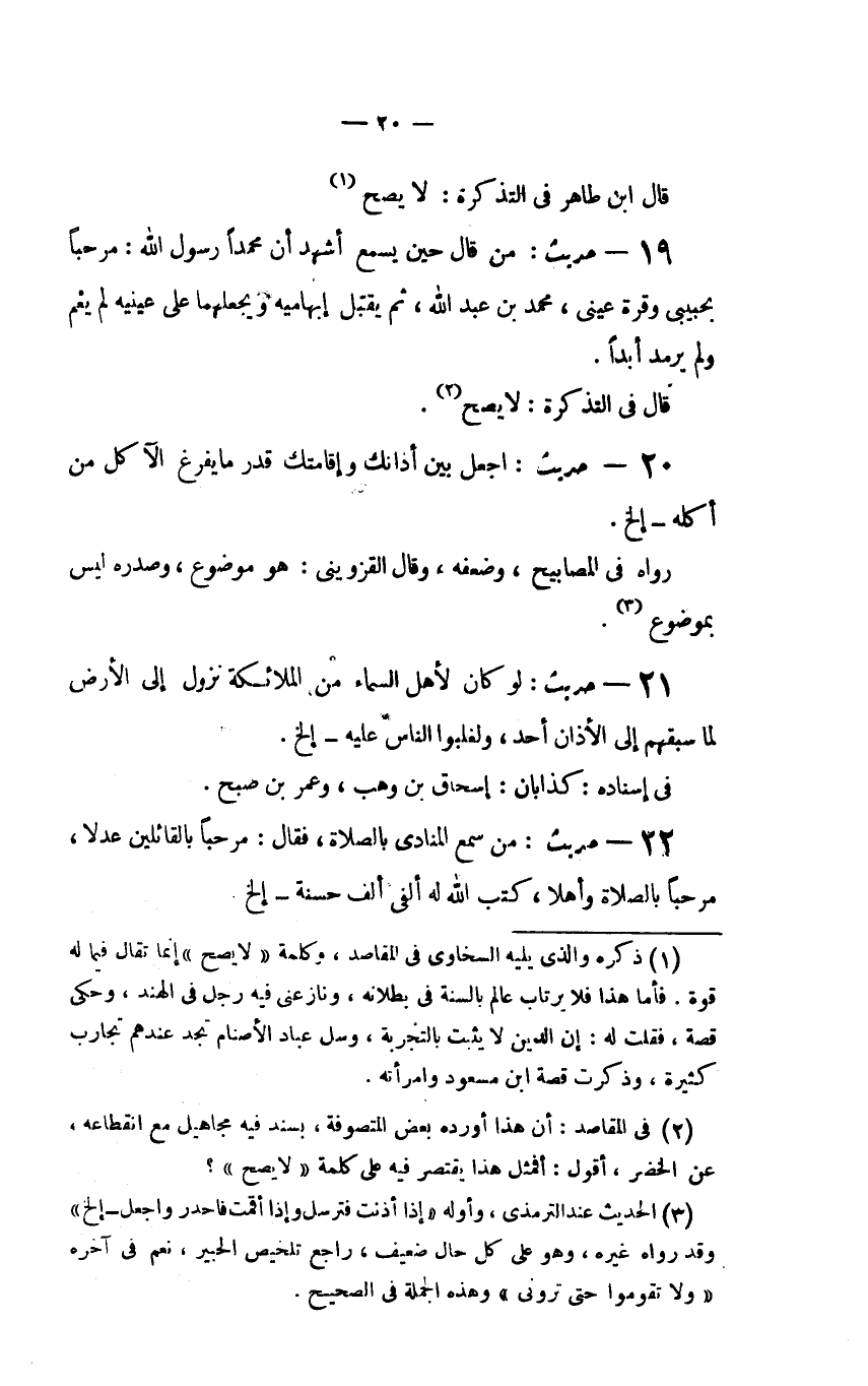 (1) ذكره والذي يليه السخاوي في المقاصد، وكلمة (لا يصح) إنما تقال فيما له قوة. فأما هذا فلا يرتاب عالم بالسنة في بطلانه، ونازعني فيه رجل في الهند، وحكى قصة، فقلت له: إن الدين لا يثبت بالتجربة، وسل عباد الأصنام تجد عندهم تجارب كثيرة، وذكرت قصة ابن مسعود وامرأته.