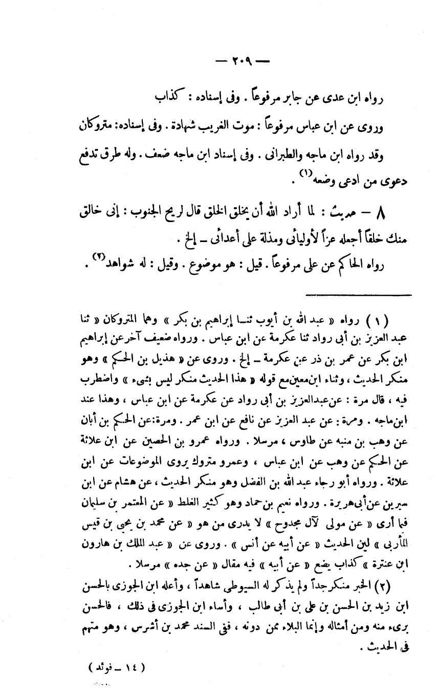 (2) الخبر منكر جداً ولم يذكر له السيوطي شاهداً، وأعله ابن الجوزي بالحسن ابن زيد بن الحسن بن علي بن أبي طالب، وأساء ابن الجوزي في ذلك، فالحسن برئ منه ومن أمثاله وإنما البلاء ممن دونه، ففي السند محمد بن أشرس، وهم متهم في الحديث.
