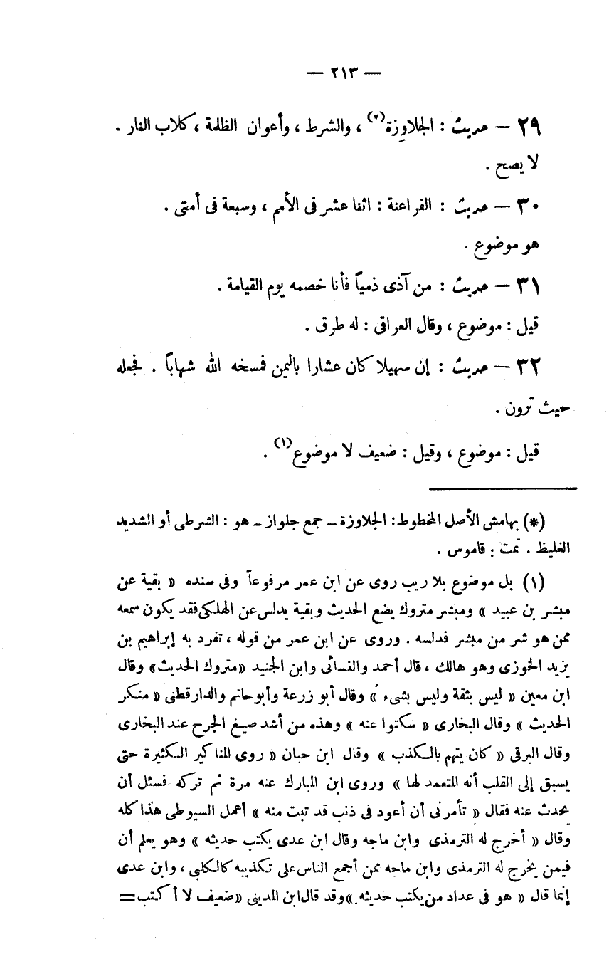 (1) بل موضوع بلا ريب روى عَنِ ابْنِ عُمَرَ مَرْفُوعًا وَفِي سنده (بقية عن مبشر بن عبيد) ومبشر متروك يضع الحديث وبقية يدلس عن الهلكي فقد يكون سمعه ممن هو شر من مبشر فدلسه. وروى عن ابن عمر من قوله، تفرد به ابراهيم بن يزيد الخوزي وهو هالك، قال أحمد والنسائي وابن الجنيد (متروك الحديث) وقال ابن معين (ليس بثقة وليس بشيء) وقال أبو زرعة وأبو حاتم والدارقطني (منكر الحديث) وقال البخاري (سكتو عنه) وهذه من أشد صيغ الجرح عند البخاري وقال البرقي (كان يتهم بالكذب) وقال ابن حبان (روى المناكير الكثيرة حتى يسبق الى القلب أنه المعتمد لها) وروى ابن المبارك عنه مرة ثم تركه فسئل أن يحدث عنه فقال (تأمرني أن أعود في ذنب قد تبت منه) أهمل السيوطي هذا كله وقال (أخرج له الترمذي وابن ماجة وقال ابن عدي يكتب حديثه) وهو يعلم أن فيمن يخرج له الترمذي وابن ماجة ممن أجمع الناس على تكذيبه كالكلبي، وابن عدي انما قال (هو في عداد من يكتب حديثه) وقد قال ابن المديني (ضعيف لا أكتب=