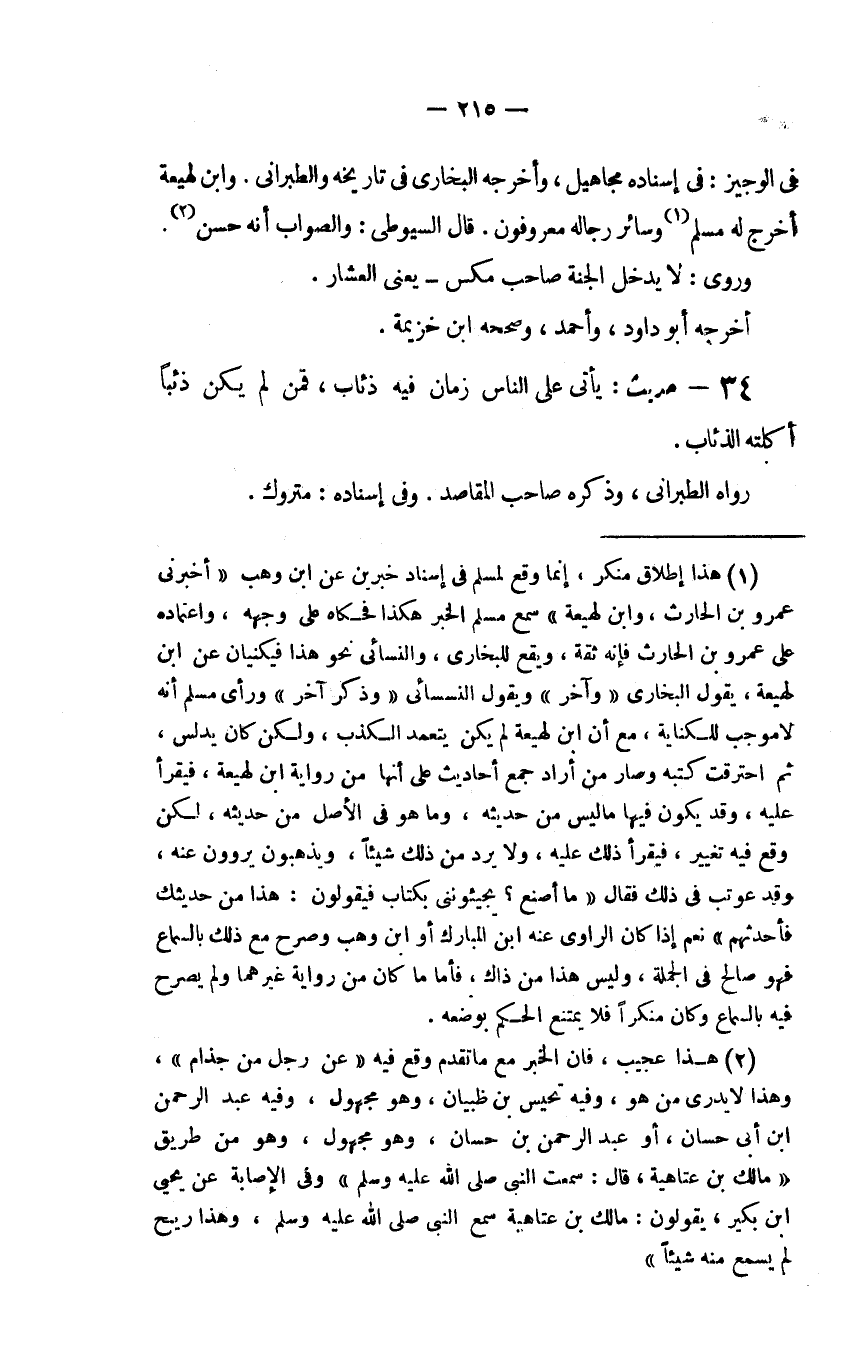 (1) هذا إطلاق منكر، إنما وقع لمسلم في إسناد خبرين عن ابن وهب (أخبرني عن عمرو بن الحارث، وابن لهيعة) سمع مسلم الخبر هكذا فحكاه على وجهه، واعتماده على عمرو بن الحارث فإنه ثقة، ويقع للبخاري، والنسائي نحو هذا فيكنيان عن ابن لهيعة، يقول البخاري (وآخر) ويقول النسائي (وذكر آخر) ورأى مسلم أنه لا موجب للكناية، مع أن ابن لهيعة لم يكن يعتمد الكذب، ولكن كان يدلس، ثم احترقت كتبه وصار من أراد جمع أحاديث على أنها من رواية ابن لهيعة، فيقرأ عليه، وقد يكون فيها ما ليس من حديثه، وما هو في الأصل من حديثه، لكن وقع فيه تغيير، فيقرأ ذلك عليه، ولا يرد من ذلك شيئا، ويذهبون يروون عنه، وقد عوتب في ذلك فقال (ما أصنع؟ يجيئونني بكتاب فيقولون: هذا من حديثك فأحدثهم) نعم إذا كان الراوي عنه ابن المبارك أو ابن وهب وصرح مع ذلك بالسماع فهو صالح في الجملة، وليس هذا من ذاك، فأما ما كان من رواية غيرهما ولم يصرح فيه بالسماع وكان منكراً فلا يمتنع الحكم بوضعه.