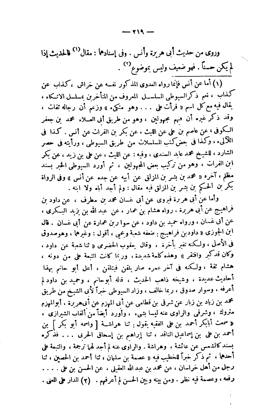 (1) أما عن أنس فإنما ما رواه العدوي المذكور نفسه عن خراش، كذاب عن كذاب، نعم ذكر السيوطي المسلسل المعروف من المتأخرين بمسلسل الأتكاء، يقال فيه مع كل اسم (قرأت على.... وهو متكئ) وزعم أن رجاله ثقات، وقد ذكر غيره أن فيهم مجهولين، وهو من طريق أبي العلاء محمد بن جعفر الكوفي، عن عاصم بن علي عن الليث، عن بكر بن الفرات عن أنس. كذا في اللآلئ، وكذا في بعض كتب المسلسلات من طريق السيوطي، ورأيته في حصر الشارد، للشيخ محمد عابد السندي، وفيه: عن الليث، عن علي بن زيد، عن بكر ابن الفرات، وهو من تركيب بعض المجهولين، ثم أورد السيوطي الخبر بسند مظلم، آخره (محمد بن بشر بن المزلق عن أبيه عن جده عن أنس) وفي الرواة بكر بن الحكم بن بشر بن المزلق فيه مقال: ولم أجد أباه ولا ابنه.