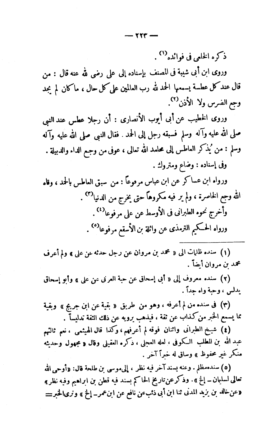 وَرَوَى ابْنُ أَبِي شَيْبَةَ فِي الْمُصَنَّفِ بِإِسْنَادِهِ إِلَى عَلِيٍّ رَضِيَ اللَّهُ عَنْهُ قَالَ: مَنْ قَالَ عِنْدَ كُلِّ عَطْسَةٍ يَسْمَعُهَا الْحَمْدُ لِلَّهِ رَبِّ الْعَالَمِينَ عَلَى كُلِّ حَالٍ، مَا كَانَ لَمْ يَجِدْ وَجَعَ الضِّرْسِ وَلا الأُذُنِ (2) .