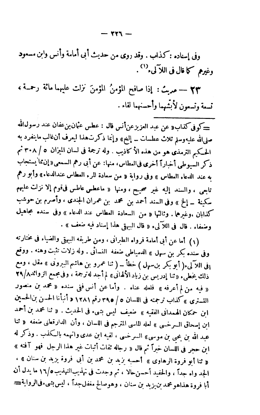 (1) أما عن أبي أمامة فرواه الطبراني، ومن طريقه البيهقي والضياء في مختارته وفي سنده بكر بن سهل) الدمياطي ضعفه الننسائي. وله زلات تثبت وهنه. ووقع في اللآلىء أبو بكر بن سهل) خطأ (ثنا عمرو بن هاشم البيروني) مقل، ومع ذلك يخطئ (ثنا إدريس بن زياد الألهاني) لم أجد له ترجمة، وفي مجمع الزوائد 8/29 (فيه من لم أعرفه) فلعله عناه. وأما عن أنس ففي سنده (محمد بن منصور التستري) كذاب ترجمته في اللسان 5/395 رقم 1281 (أنبأنا الحسن بن الحسين ابن حكمان الهمداني الفقيه) ضعيف ليس بشيء في الحديث. (ثنا محمد بن أحمد ابن اسحاق السرخسي) لعله الماسي المترجم في اللسان، وأن الدارقطني ضعفه (ثنا عبد الله بن يحيى بن موسى) السرخسي، لقيه ابن عدي واتهمه بالكذب. وذكر له ابن حجر في اللسان خبراً ثم قال (رجاله ثقات أثبات غير هذا الرجل فهو آفته) (ثنا أبو فروة الرهاوي) أحسبه يزيد بن محمد بن أبي فروة يزيد بن سنان) ، الجد واه جداً، والحفيد أحسن حالاً، ثم وجدت في تهذيب التهذيب 5/16 ما يدل أن أبا فروة هذا هو محمد بن يزيد بن سنان، وهو صالح مغفل جداً، ليس بشيء في الرواية =