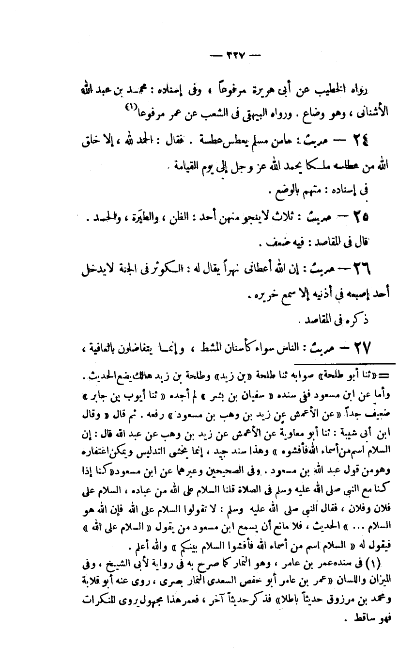 = (حدثنا أبو طلحة) صوابه ثنا طلحة (بن زيد) وطلحة بن زيد هالك يضع الحديث. وأما عن ابن مسعود ففي سنده (سفيان بن بشر) لم أجده (ثنا أيوب بن جابر) ضغيف جداً (عن الأعمش عن زيد بن وهب بن مسعود) رفعه. ثم قال (وقال ابن أبي شيبة: ثنا أبو معاوية عن الأعمش عن زيد بن وهب عن عبد الله قال: إِنَّ السَّلامَ اسْمٌ مِنْ أَسْمَاءِ الله فأفشوه) وهذا سند جيد، إنما يخشى التدليس ويمكن اغتفاره وهو مِنْ قَوْلِ عَبْدِ اللَّهِ بْنِ مسعود. وفي الصحيحين وغيرهما عن ابن مسعود (كنا إذا كنا مع النبي صلى الله عيه وسلم في الصلاة قلنا السلام على الله من عباده، السلام على فلان وفلان، فقال النبي صلى الله عليه وسلم: لاتقولوا السلام على الله فإن الله هو السلام....) الحديث، فلا مانع أن يسمع ابن مسعود من يقول (السلام على الله) فيقول له (السلام اسم من أسماء الله فافشوا السلام بينكم) والله أعلم.
