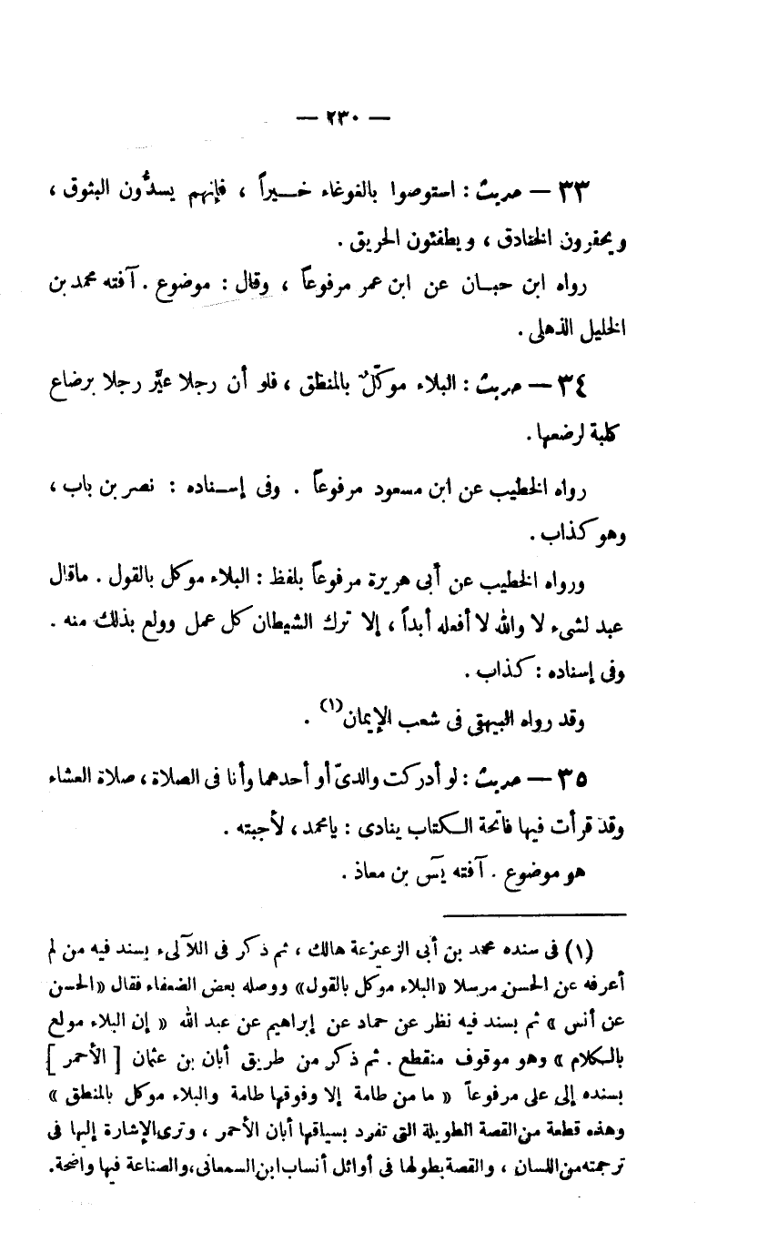 (1) في سنده محمد بن أبي الزعيزعة هالك، ثم ذكر في اللآلىء بسند فيه من لم أعرفه عن الحسن مرسلا (البلاء موكل بالقول) ووصله بعض الضعقاء فقال (الحسن عن أنس) ثم بسند فيه نظر عن حماد عن إبراهيم عن عبد الله (إن البلاء مولع بالكلام) وهو موقوف منقطع. ثم ذكر من طريق أبان بي عثمان [الأحمر] بسنده إلى علي مرفوعاً (ما من طامة إلا وفوقها طامة والبلاء موكل بالمنطق) وهذه قطعة من القصة الطويلة التي تفرد بسياقها أبان الأحمر، وترى الإشارة إليها في ترجمته من اللسان، والقصة بطولها في أوائل أنساب ابن السمعان، والصناعة فيها واضحة.