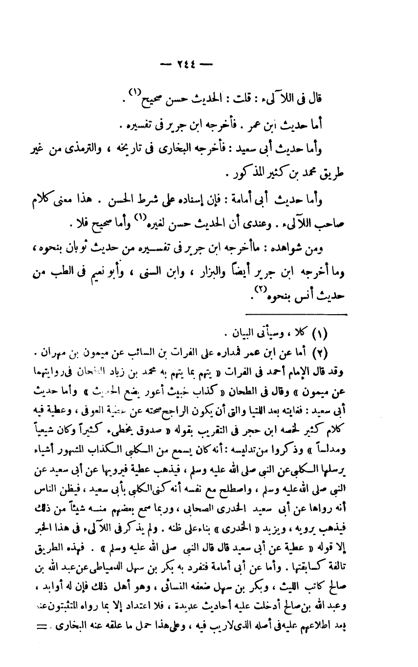(2) أما عن ابن عمر فمداره على الفرات بن السائب عن ميمون بن مهران. وقد قال الإمام أحمد في الفرات (يتهم بما يتهم به محمد بن زياد الطحان في روايتهما عن ميمون) وقال في الطحان (كذاب خبيث أعور يضع الحديث) وأما حديث أبي سعيد: فغايته بعد اللتيا والتي أن يكون الراجح صحته عن عطيه العوفي، وعطيه فيه كلام كثير لخصه ابن حجر في التقريب بقوله (صدوق يخطئ كثيراً وكان شيعياً ومدلساً) وذكروا من تدليسه: أنه كان يسمع من الكلبي الكذاب المشهور أشياء يرسلها الكلبي عن النبي صلى الله عليه وسلم، فيذهب عطية فيرويها عن أبي سعيد عن النبي صلى الله عليه وسلم، واصطلح مع نفسه أنه كنى الكلبي بأبي سعيد، فيظن الناس أنه رواها عن أبي سعيد الخدري الصحابي، وربما سمع بعضهم منه شيئاً من ذلك فيذهب يرويه، ويزيد (الخدري) بناء على ظنه. ولم يذكر في اللآلىء في هذا الخبر إلا قوله (عطية عن أبي سعيد قال قال النبي صلى الله عليه وسلم) . فهذه الطريق تالفة كسابقتها. وأما عن أبي أمامة فتفرد به بكر بن سهل الدمياطي عن عبد الله بن صالح كاتب الليث، وبكر بن سهل ضعفه النسائي، وهو أهل ذلك فإن له أوابد، وعبد الله ابن صالح أدخلت عليه أحاديث عديدة، فلا اعتداد الا بما رواه المتثبتون عنه بعد اطلاعهم عليه في أصله الذي لا ريب فيه، وعلى هذا حمل ما علقه عنه البخاري=