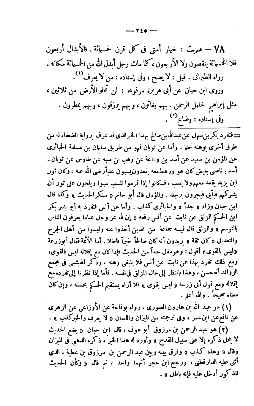 (2) هو عبد الرحمن بن مرزوق أبو عوف، قال ابن حبان (يضع الحديث لا يحل ذكره الا على سبيل القدح) وأورد له هذا الخبر، ذكره الذهبي في الميزان وقال (هذا كذب) وفرق بينه وبين عبد الرحمن بن مرزوق بن عطية، الذي أثنا عليه الدارقطني ورجح ابن حجر انهما واحد، ثم قال (وكان الحديث المذكرو أدخل عليه فإنه باطل) .