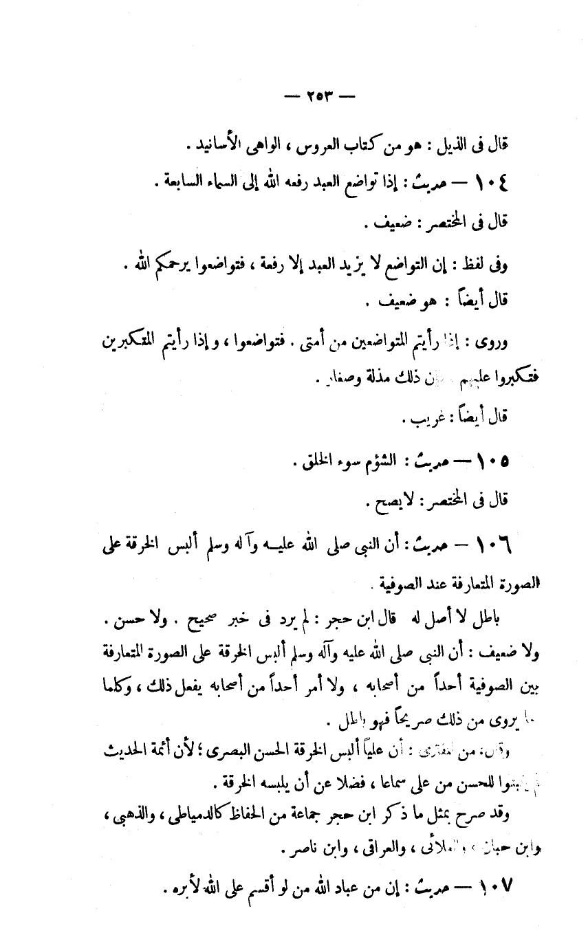 106 - حديث: "أَنَّ النَّبِيَّ صَلَّى اللَّهُ عَلَيْهِ وَآلِهِ وَسَلَّمَ أَلْبَسَ الْخِرْقَةَ عَلَى الصُّورَةِ الْمُتَعَارَفَةِ عِنْدَ الصُّوفِيَةِ.