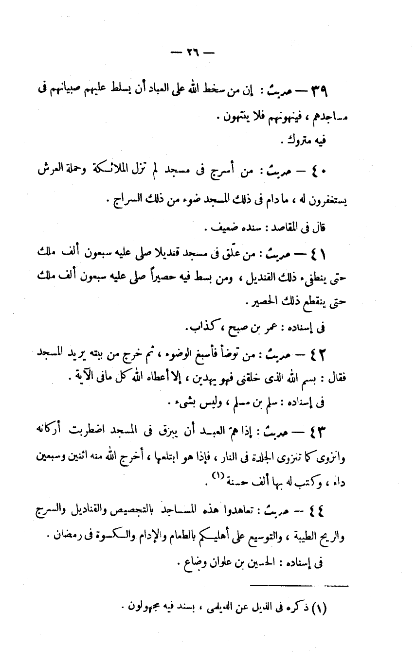 40 - حديث: "مَنْ أَسْرَجَ فِي مَسْجِدٍ لَمْ تَزَلِ الْمَلائِكَةُ وَحَمَلَةُ الْعَرْشِ يَسْتَغْفِرُونَ لَهُ مَا دَامَ فِي ذَلِكَ الْمَسْجِدِ ضَوْءٌ مِنْ ذَلِكَ السِّرَاجِ.