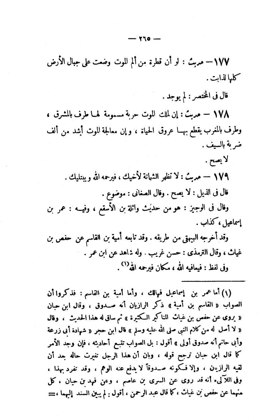 (1) أما عمر بن إسماعيل فهالك، وأما أمية بن القاسم: فذكروا أن الصواب (القاسم بن أمية) ذكر الرازيان أنه صدوق، وقال ابن حبان (يروي عن حفص بن غياث المناكير الكثيرة) ثم ساق له هذا الحديث، وقال (لا أصل له من كلام النَّبِيِّ صَلَّى اللَّهُ عَلَيْهِ وَسَلَّمَ) قال ابن حجر (شهادة أبي زرعة وأبي حاتم أنه صدوق أولى) أقول: بل الصواب تتبع أحاديثه، فإن وجد الأمر كما قال ابن حبان ترجح قوله، وبان أن هذا الرجل تغيرت حاله بعد أن لقيه الرازيان، وإلا فكونه صدوقاً لا يدفع عنه الوهم، وقد تفرد بهذا، وفي اللآلىء أنه قد روى عن السري بن عاصم، وعن فهد بن حيان، كل منهما عن حفص بن غياث، كما قال عبد الرحمن، أقول: لم يبين السند إليهما،=