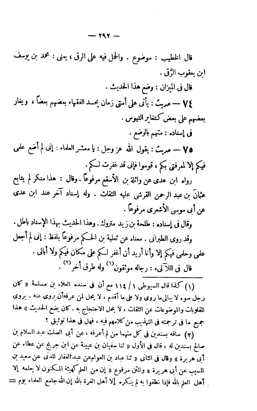 (1) كذا قال السيوطي 1/114 مع أن في سنده العلاء بن مسلمة (كان رجال سوء لايبالي ما روى ولاعلى ما أقدم، لايحل لمن عرفه أن يروي عنه. يروي المقلوبات والموضوعات عن الثقات، لا يحل الاحتجاج به. كان يضع الحديث) هذا جميع ما في ترجمته في التهذيب من كلامهم فيه، فهل هذا توثيق؟