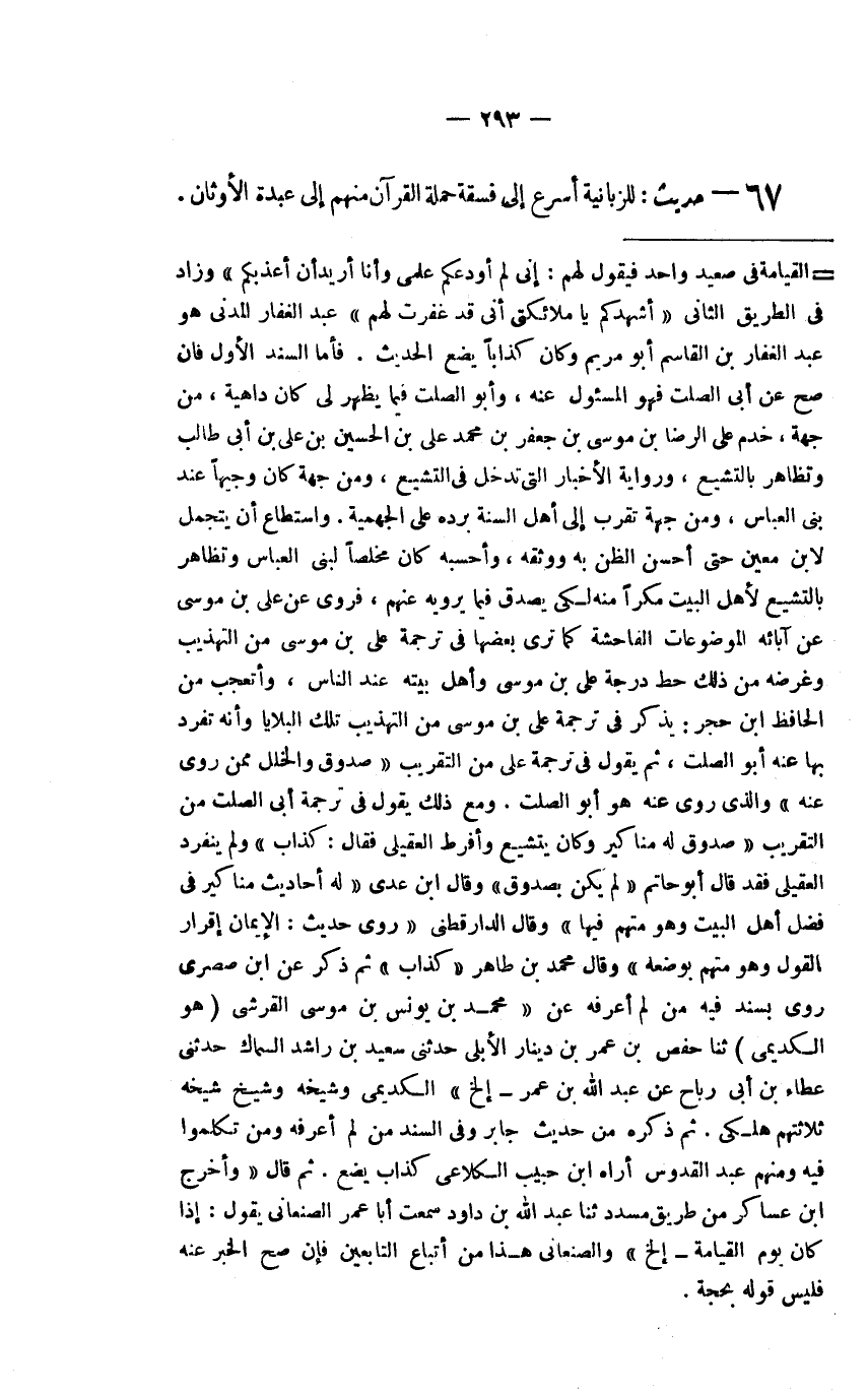 = القيامة في صعيد واحد فيقول لهم: إني لم أودعكم علمي وأنا أريد أن أعذبكم) وزاد في الطريق الثاني (أشهدكم يا ملائكتي أني قد غفرت لهم) عبد الغفار المدني هو عبد الغفار بن القاسم أبو مريم وكان كذاباً يضع الحديث. فأما السند الأول فإن صح عن أبي الصلت فهو المسؤل عنه، وأبو الصلت فيما يظهر لي كان داهية، من جهة، خدم على الرضا بن موسى بن جعفر بن محمد بن الحسين بن علي بن أبي طالب وتظاهر بالتشيع، ورواية الأخبار التي تدخل في التشيع، ومن جهة كان وجيهاً عند بني العباس، ومن جهة تقرب إلى أهل السنة برده على الجهيمة. واستطاع أن يتجمل لابن معين حتى أحسن الظن به ووثقه، وأحسبه كان مخلصاً لبني العباس وتظاهر بالتشيع لأهل البيت مكراً منه لكي يصدق فيما يرويه عنهم، فروى عن علي بن موسى عن آبائه الموضوعات الفاحشة كما ترى بعضها في ترجمة علي بن موسى من التهذيب وغرضه من ذلك حط درجة علي بن موسى وأهل بيته عند الناس، وأتعجب من الحافظ ابن الحجر: يذكر في ترجمة علي بن موسى من التهديب تلك البلايا وأنه تفرد بها عنه أبو الصلت، ثم يقول في ترجمة علي من التقريب (صدوق والخلل ممن روى عنه) والذي روى عنه هو أبو الصلت. ومع ذلك يقول في ترجمة أبي الصلت من التقريب (صدوق له مناكير وكان يتشيع وأفرط العقيلي فقال: كذاب) ولم ينفرد العقيلي فقد قال أبو حاتم (لم يكن بصدوق) وقال ابن عدي (له أحاديث مناكير في فضل أهل البيت وهومتهم فيها) وقال الدارقطني (روى حديث: "الإيمان إقرار القول وهو متهم بوضعه) وقال محمد بن طاهر (كذاب) ثم ذكر عن ابن صصري روى بسند فيه من لم أعرفه عن (محمد بن يونس بن موسى القرشي] هو الكديمي [ثنا حفص بن عمر بن دينار الأبلي حدثني سعيد بن راشد السماك حدثني عطاء بن أبي رباح عن عبد الله بن عمر إلخ) الكديمي وشيخه وشيخ شيخه ثلاثتهم هلكى. ثم ذكره من حديث جابر وفي السند من لم أعرفه ومن تكلموا فيه ومنهم عبد القدوس أراه ابن حبيب الكلاعي كذاب يضع. ثم قال (وأخرج ابن عساكر من طريق مسدد ثنا عبد الله بن داود سمعت أبا عمر الصنعاني يقول: إذا كان يوم القيامة إلخ) والصنعاني هذا من أتباع التابعين فإن صح الخبر عنه فليس قوله بحجة.