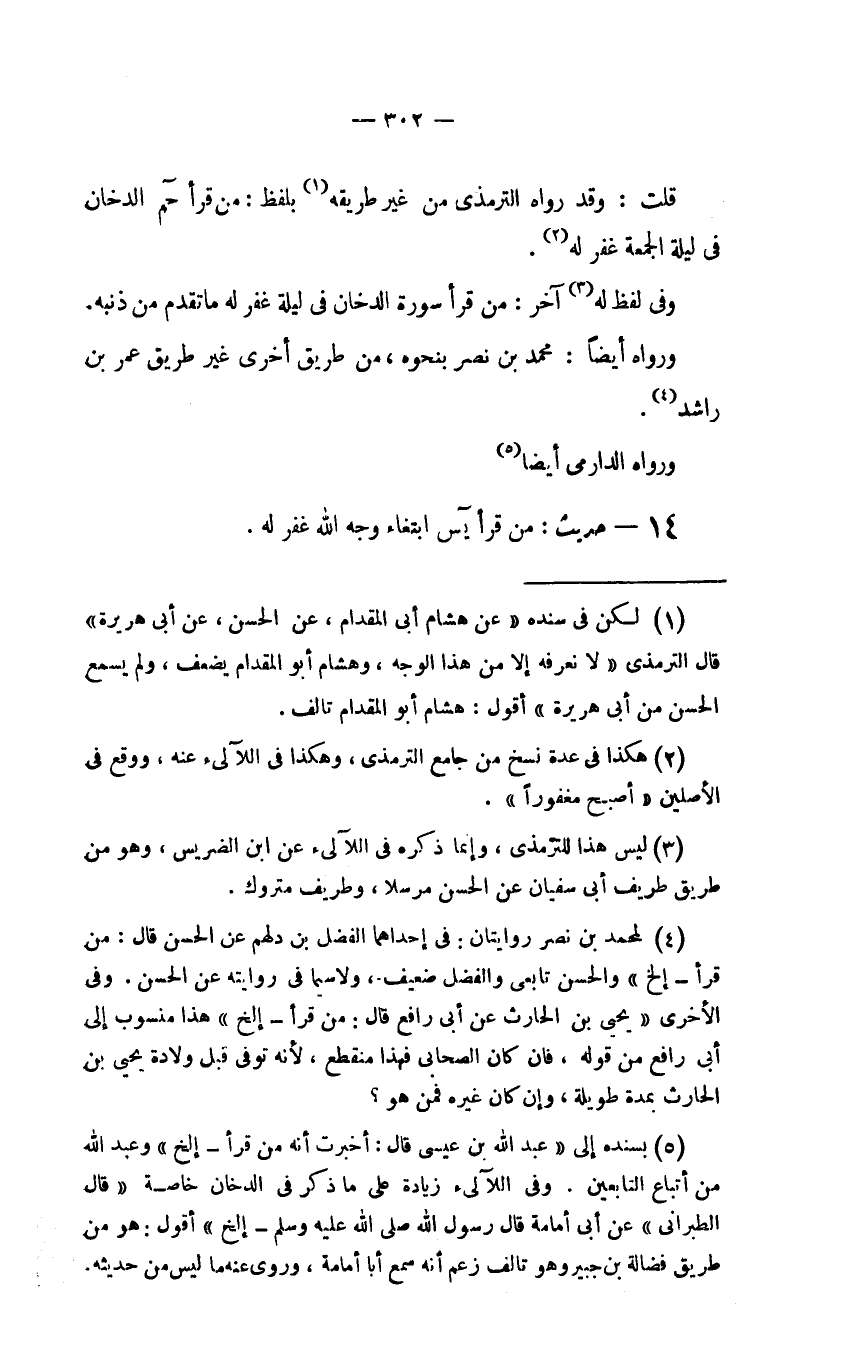 (4) لمحمد بن نصر روايتان: في إحداهما الفضل بن دلهم عن الحسن قال: من قرأ إلخ) والحسن تابعي والفضل ضعيف؛ ولا سيما في روايته عن الحسن. وفي الأخرى (يحيى بن الحارث عن أبي رافع قال: من قرأ إلخ) هذا منسوب إلى أبي رافع من قوله، فإن كان الصحابي فهذا منقطع، لأنه توفي قبل ولادة يحيى بن الحارث بمدة طويلة، وإن كان غيره فمن هو؟.