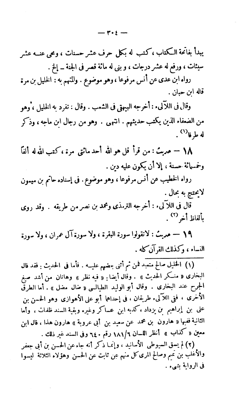 (1) الخليل صالح متعبد فمن ثم أثنى بعضهم عليه. أما في الحديث: "فقد قال البخاري (منكر الحديث) . وقال أيضاً (فيه نظر) وهاتان من أشد صيغ الجرح عند البخاري. قال أبو الوليد الطيالسي (ضال مضل) أما الطرق الأخرى، ففي الألىء طريقان، في أحداهما أبو علي الاهوازي وهو الحسن بن علي بن إبراهيم بن يزداد، كذبه ابن عساكر وغيره وبقيه السند ظلمات، وأما الثانية ففيها (هارون بن محمد عن سعيد بن أبي عروبة) هارون هذا، قال ابن معين (كذاب) أنظر اللسان 6/181 رقم 640 وفي السند غير ذلك.