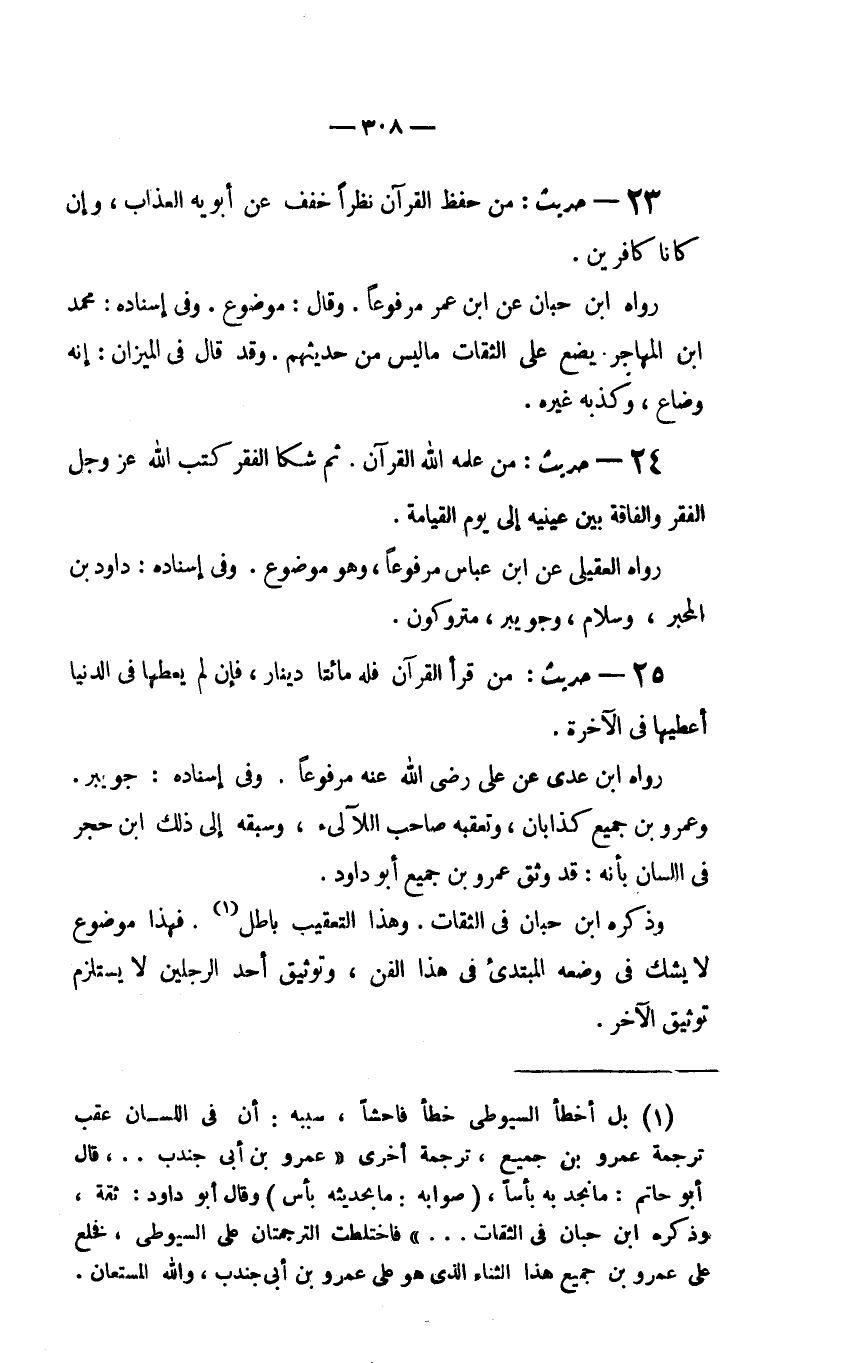 (1) بل أخطأ السيوطي خطأ فاحشاً، سببه: أن في اللسان عقب ترجمة عمرو بن جميع، ترجمة أخرى (عمرو بن أبي جندب ... ، قال أبو حاتم: ما نجد به بأساً، [صوابه: ما بحديثه بأس] وقال أبو داود: ثقة، وَذَكَرَهُ ابْنُ حِبَّانَ فِي الثِّقَاتِ ... ) فاختلطت الترجمتان على السيوطي، فخلع على عمرو بن جميع هذا الثناء الذي هو على عمرو بن أبي جندب، والله المستعان.