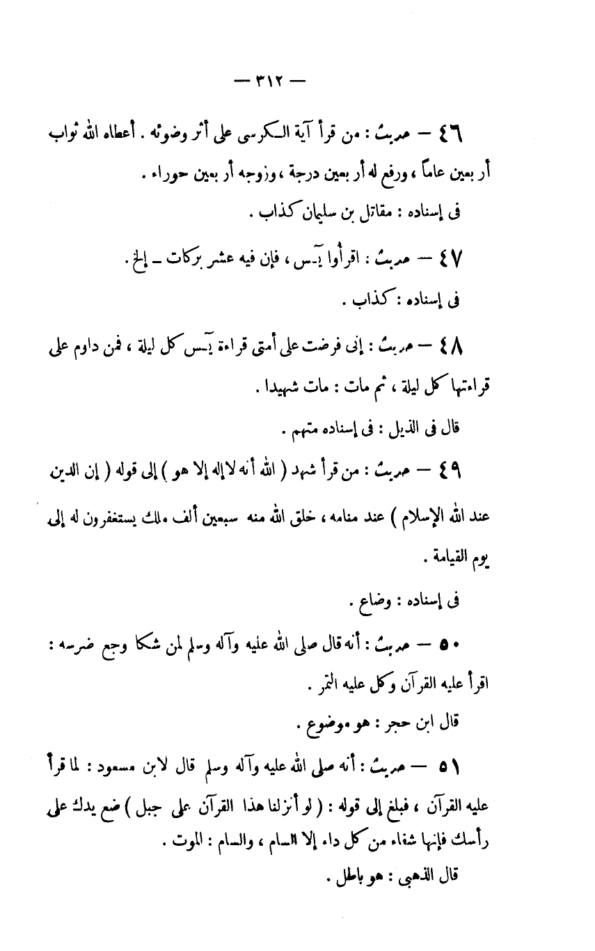 51 - حديث: "إِنَّهُ صَلَّى اللَّهُ عَلَيْهِ وَآلِهِ وَسَلَّمَ قَالَ لابْنِ مَسْعُودٍ: لَمَّا قَرَأَ عَلَيْهِ الْقُرْآنَ، فَبَلَغَ إِلَى قوله: (لو أنزلنا هذا القرآن على جبل) ضَعْ يَدَكَ عَلَى رَأْسِكَ فَإِنَّهَا شِفَاءٌ مِنْ كُلِّ دَاءٍ إِلا السَّامَ"، وَالسَّامُ: الْمَوْتُ.