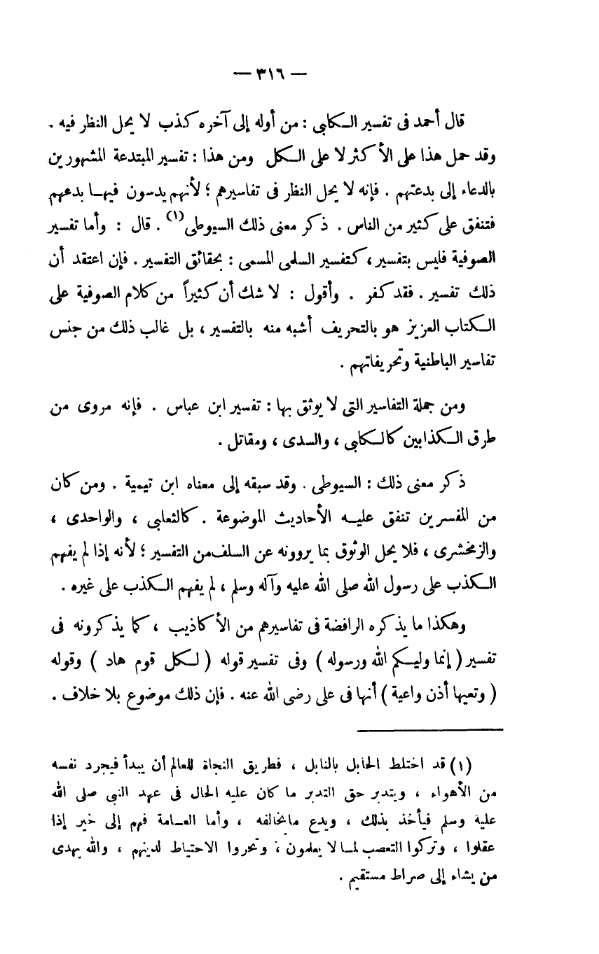 قال أحمد في تفسير الكلبي: من أوله إلى آخره كذب لا يحل النظر فيه. وقد حمل هذا على الأكثر لا على الكل ومن هذا: تفسير المبتدعة المشهورين بالدعاء إلى بدعتهم. فإنه لا يحل النظر في تفاسيرهم؛ لأنهم يدسون فيها بدعهم فتنفق على كثير من الناس. ذكر معنى ذلك السيوطي (1) . قال: وأما تفسير الصوفية فليس بتفسير، كتفسير السلمي المسمى: بحقائق التفسير. فإن اعتقد أن ذلك تفسير. فقد كفر. وأقول: لا شك أن كثيرًا من كلام الصوفية على الكتاب العزيز هو بالتحريف أشبه منه بالتفسير، بل غالب ذلك من جنس تفاسير الباطنية وتحريفاتهم.