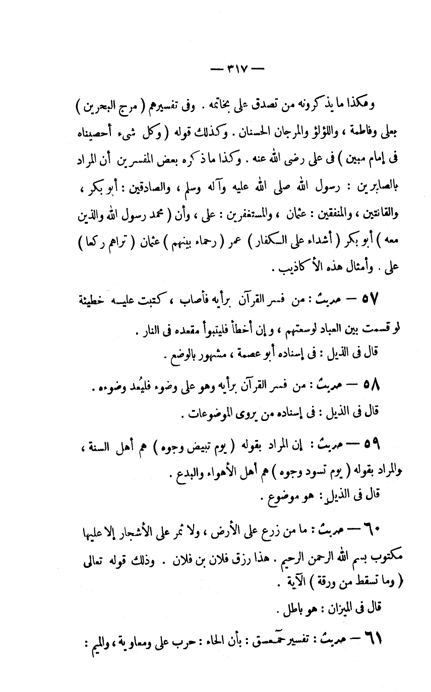 58 - حديث: "مَنْ فَسَّرَ الْقُرْآنَ بِرَأْيِهِ وَهُوَ عَلَى وُضُوءٍ فَلْيُعِدْ وُضَوءَهُ.