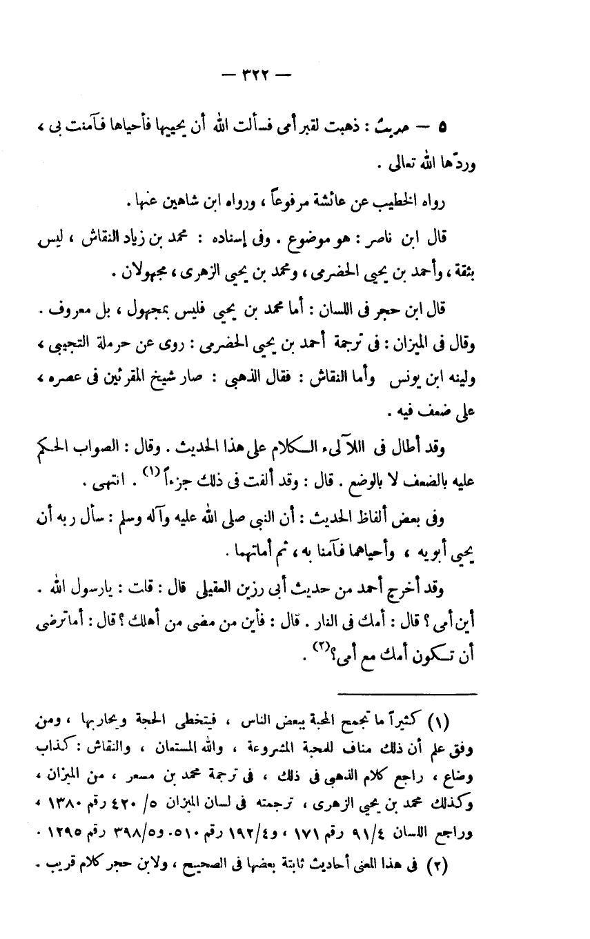 (1) كثيراً ما تجمع المحبة ببعض الناس، فيتخطى الحجة ويحاربها، ومن وفق علم أن ذلك مناف للمحبة المشروعة، والله المستعان، والنقاش: كذاب وضاع، راجع كلام الذهبي في ذلك، في ترجمة محمد بن مسعر، من الميزان، وكذلك محمد بن يحيى الزهري، ترجمته في لسان الميزان 5/420 رقم 1380، وراجع اللسان 4/91 رقم 171، 4/192 رقم 510. و5/398 رقم 1295