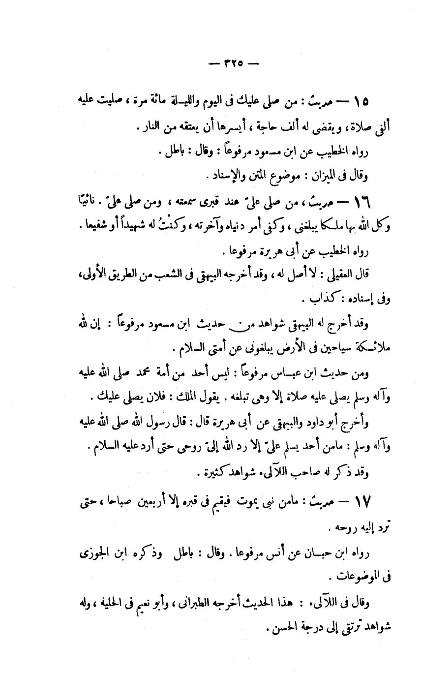 16 – حديث، مَنْ صَلَّى عَلَيَّ عِنْدَ قَبْرِي سَمِعْتُهُ، وَمَنْ صَلَّى عَلَيَّ. نَائِيًا وَكَّلَ اللَّهُ بِهَا مَلَكًا يُبَلِّغُنِي، وَكُفِيَ أَمْرَ دُنْيَاهُ وَآخِرَتِهِ، وَكُنْتُ لَهُ شَهِيدًا أَوْ شَفِيعًا".