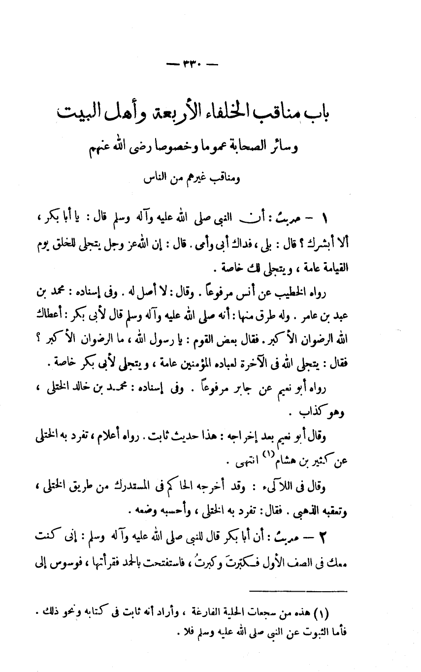 1 - حديث: "أَنَّ النَّبِيَّ صَلَّى اللَّهُ عَلَيْهِ وَآلِهِ وَسَلَّمَ قَالَ: يَا أَبَا بَكْرٍ، أَلا أُبَشِّرُكَ؟ قَالَ: بَلَى، فِدَاكَ أَبِي وَأُمِّي. قَالَ: إِنَّ اللَّهَ عَزَّ وَجَلَّ يَتَجَلَّى لِلْخَلْقِ يَوْمَ الْقِيَامَةِ عَامَّةً، وَيَتَجَلَّى لَكَ خَاصَّةً".