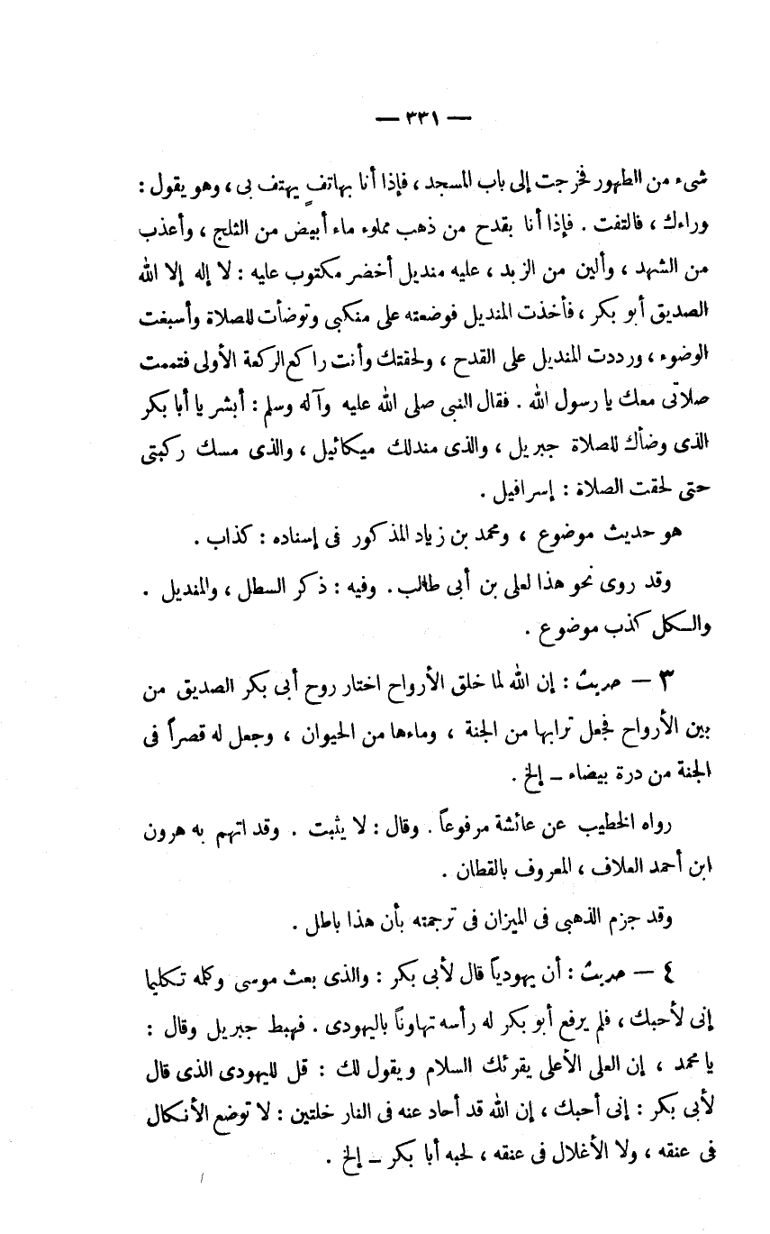 3 - حديث: "إِنَّ اللَّهَ لَمَّا خَلَقَ الأَرْوَاحَ اخْتَارَ رُوحَ أَبِي بَكْرٍ الصِّدِّيقِ مِنْ بَيْنِ الأَرْوَاحِ فَجَعَلَ تُرَابَهَا مِنَ الْجَنَّةِ، وَمَاءَهَا مِنَ الْحَيَوَانِ، وَجَعَلَ لَهُ قَصْرًا فِي الْجَنَّةِ مِنْ دُرَّةٍ بَيْضَاءَ _ إلخ".