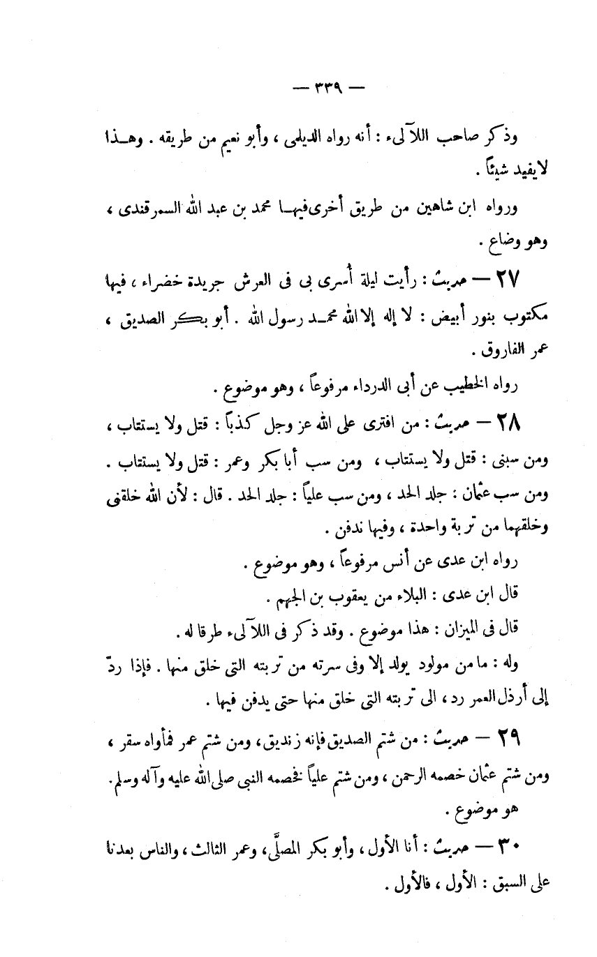 29 - حديث: "مَنْ شَتَمَ الصِّدِّيقَ فَإِنَّهُ زِنْدِيقٌ، وَمَنْ شَتَمَ عُمَرَ فَمَأْوَاهُ سَقَرُ، ومن شتم عثمان خصمه الرَّحْمَنُ، وَمَنْ شَتَمَ عَلِيًّا فَخَصْمُهُ النَّبِيِّ صَلَّى اللَّهُ عَلَيْهِ وَآلِهِ وسلم.