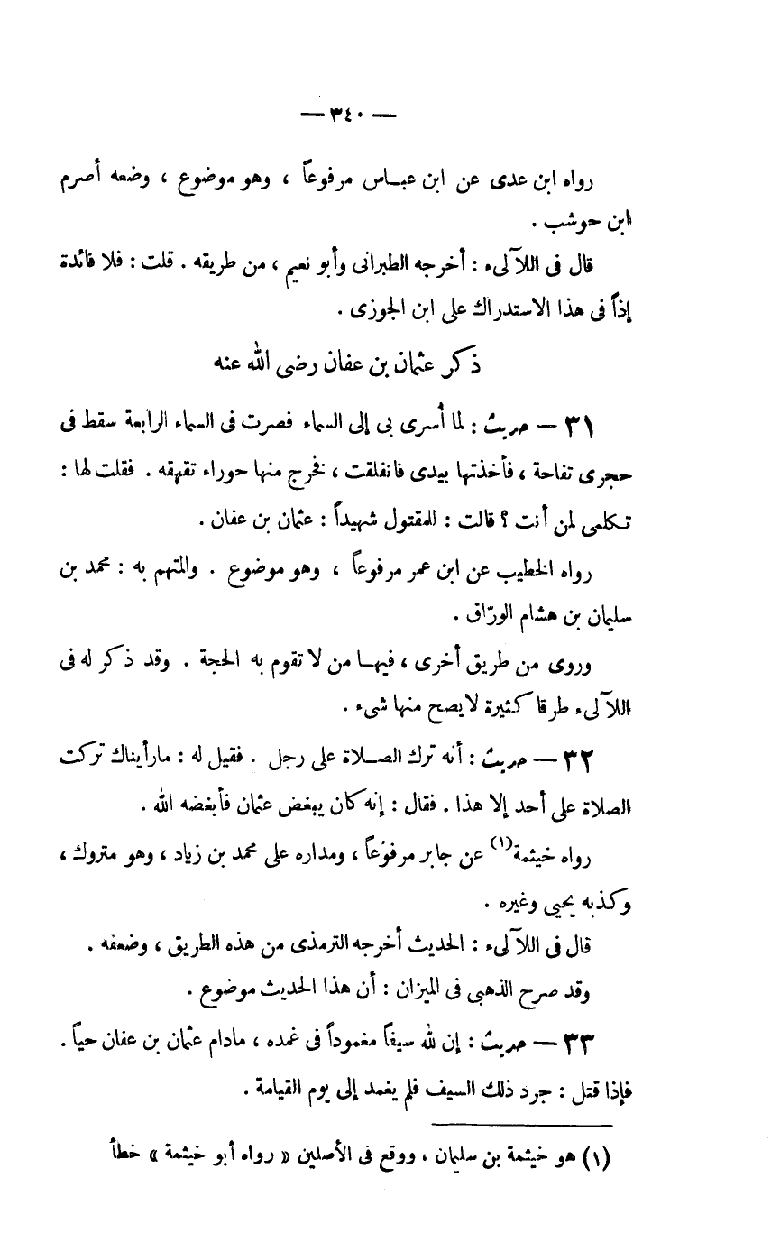 31 - حديث: "لَمَّا أُسْرِيَ بِي إِلَى السَّمَاءِ فَصِرْتُ فِي السَّمَاءِ الرَّابِعَةِ سَقَطَ في حجري تفاحة، فأخذتها بيدي فانفلقت، فَخَرَجَ مِنْهَا حَوْرَاءُ تُقَهْقِهُ. فَقُلْتُ لَهَا: تَكَلَّمِي لِمَنْ أَنْتِ؟ قَالَتْ: لِلْمَقْتُولِ شَهِيدًا: عُثْمَانَ بْنِ عَفَّانَ".