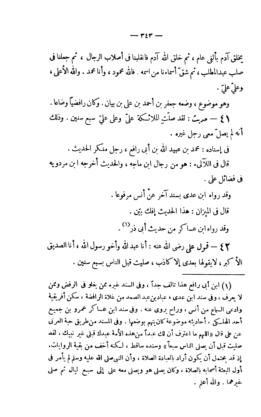 (1) ابن أبي رافع هذا تالف جداً، وفي السند غيره ممن يغلوا في الرفض وممن لا يعرف، وفي سند ابن عدي، عباد بن عبد الصمد من غلاة الرافضة، سكن أفريقية وادعى السماع من أنس، وراح يروي عنه. وفي سند ابن عساكر عمرو بن جميع أحد الهلكى، أحاديثه موضوعة كان يتهم بوضعها. وفي المسند من طريق حبة العرنى عن علي قال (اللهم ما أعترف أن لك عبداً من هذه الأمة عبدك قبلي غير نبيك، لقد صليت قبل أن يصلي الناس سبعاً) وسنده ساقط، لكنه أخف من بقية الروايات. إذ قد يحتمل أن يكون أراد بالعبادة الصلاة، وأن النَّبِيِّ صَلَّى اللَّهُ عَلَيْهِ وَسَلَّمَ لم يأمر في أول البعثة أصحابه بالصلاة، وكان يصلي هو ويصلي معه علي إلى سبع ليال ثم صلى غيرهما. والله أعلم