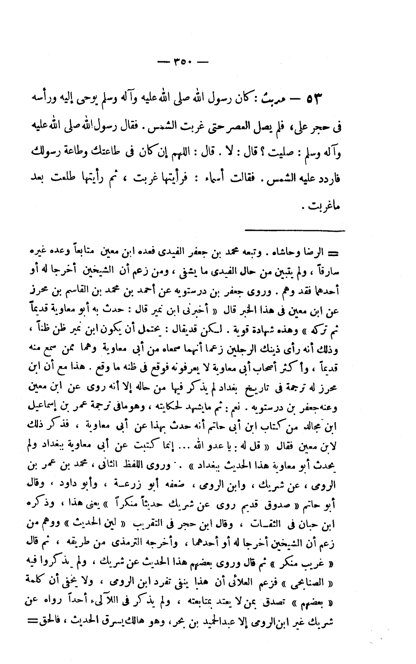 53 - حديث: "كَانَ رَسُولُ اللَّهِ صَلَّى اللَّهُ عَلَيْهِ وَآلِهِ وَسَلَّمَ يُوحَى إِلَيْهِ وَرَأْسُهُ فِي حِجْرِ عَلِيٍّ، فَلَمْ يُصَلِّ الْعَصْرَ حَتَّى غَرَبَتِ الشَّمْسُ. فَقَالَ رَسُولُ اللَّهِ صَلَّى اللَّهُ عَلَيْهِ وَآلِهِ وَسَلَّمَ: صَلَّيْتَ؟ قَالَ: لا. قَالَ: اللَّهُمَّ إِنْ كَانَ فِي طَاعَتِكَ وَطَاعَةِ رَسُولِكَ فَارْدُدْ عَلَيْهِ الشَّمْسَ. فَقَالَتْ أَسْمَاءُ: فَرَأَيْتُهَا غربت، ثم رأيتها طلعت بعد ما غربت".