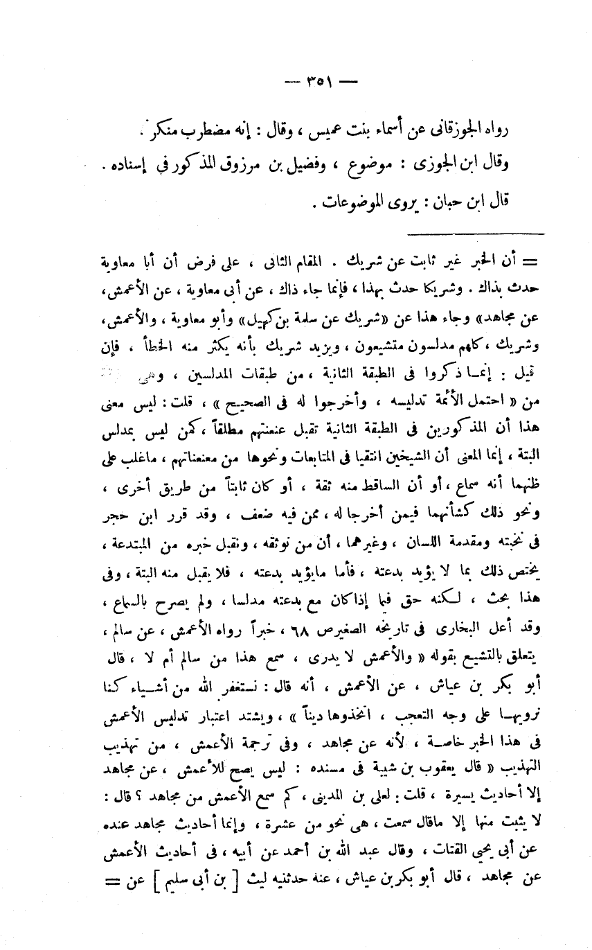 = أن الخبر غير ثابت عن شريك. المقام الثاني، على فرض أن أبا معاوية حدث بذاك. وشريكاً حدث بهذا، فإنما جاء ذاك، عن أبي معاوية، عن الأعمش، عن مجاهد) وجاء هذا عن (شريك عن سلمة بن كهيل) وأبو معاوية، والأعمش، وشريك، كلهم مدلسون متشيعون، ويزيد شريك بأنه يكثر من الخطأ، فإن قيل: إنما ذكروا في الطبقة الثانية، من طبقات المدلسين، وهي طبقة من (احتمل الأمة تدليسه، وأخرجوا له في الصحيح) ، قلت: ليس معنى هذا أن المذكورين في الطبقة الثانية تقبل عنعنتهم مطلقاً، كمن ليس بمدلس البتة، إنما المعنى أن الشيخين انتقيا في المتابعات ونحوها في معنعناتهم، ما غلب على ظنهما أنه سماع، أو أن الساقط منه ثقة، أو كان ثابتاً من طريق أخرى، ونحو ذلك كشأنهما فيمن أخرجا له، ممن فيه ضعف، وقد قرر ابن حجر في نخبته ومقدمة اللسان، وغيرهما، أن من نوثقه، ونقبل خبره من المبتدعة، يختص ذلك بما لا يؤيد بدعته، فأما ما يؤيد بدعته، فلا يقبل منه البتة، وفي هذا البحث، لكنه حق فيما إذا كان مع بدعته مدلساً، ولم يصرح بالسماع، وقد أعل البخاري في تاريخه الصغير ص 68، خبراً رواه الأعمش، عن سالم، يتعلق بالتشيع بقوله (والأعمش لا يدري، سمع هذا من سالم أم لا، قال أبو بكر بن عياش، عن الأعمش، أنه قال: نستغفر الله من أشياء كنا نرويها على وجه التعجب، اتخذوها ديناً) ، ويشتد اعتبار تدليس الأعمش في هذا الخبر خاصة، لأنه عن مجاهد، وفي ترجمة الأعمش، من تهذيب التهذيب (قال يعقوب بن شيبة في مسنده: ليس يصح للأعمش، عن مجاهد إلا أحاديث يسيرة، قلت: لعلي بن المديني، كم سمع الأعمش من مجاهد؟ قال: لا يثبت منها إلا ما قال سمعت، هي نحو من عشرة، وإنما أحاديث مجاهد عنده عن أبي يحيى القتات، وقال عبد الله بن أحمد عن أبيه، في أحاديث الأعمش عن مجاهد، قال أبو بكر بن عياش، عنه حدثنيه ليث] بن أبي سليم عن=