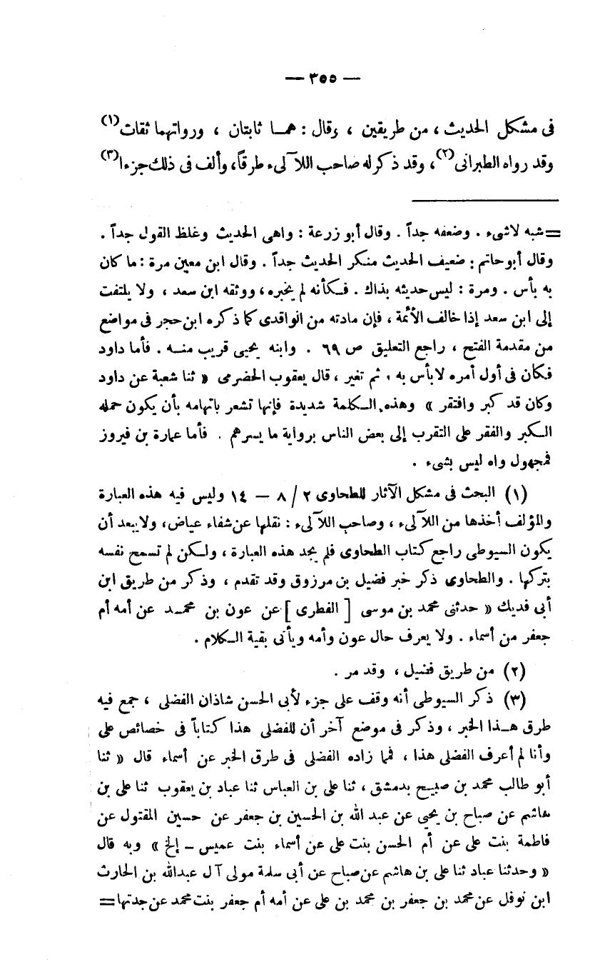(1) البحث في مشكل الآثار للطحاوي 2/8 14 وليس فيه هذه العبارة والمؤلف أخذها من اللآلىء، وصاحب اللآلىء: نقلها عن شفاء عياض، ولا يبعد أن يكون السيوطي راجع كتاب الطحاوي فلم يجد هذه العبارة، ولكن لم تسمح نفسه بتركها. والطحاوي ذكر خبر فضيل بن مرزوق وقد تقدم، وذكر من طريق ابن أبي فديك (حدثني محمد بن موسى] الفطري [عن عون بن محمد عن أمه أم جعفر من أسماء. ولا يعرف حال عون وأمه ويأتي بقية الكلام