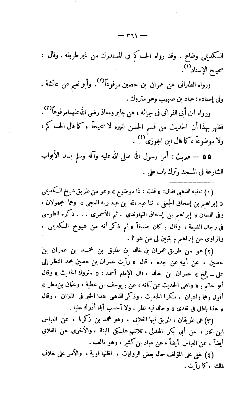 (2) هو من طريق عمران بن خالد بن طليق بن محمد بن عمران بن حصين، عن أبيه عن جده، قال (رأيت عمران بن حصين يحد النظر إلى علي إلخ) عمران بن خالد، قال الإمام أحمد: (متروك الحديث) وقال أبو حاتم: (واهي الحديث عن آبائه، عن: يوسف بن عطية، وعثمان بن مطر) أقول وهما واهيان، منكرا الحديث، وذكر الذهبي هذا الخبر في الميزان، وقال (هذا باطل في نقدي) وخالد فيه نظر، ولا أحسب أباه أدرك علياً