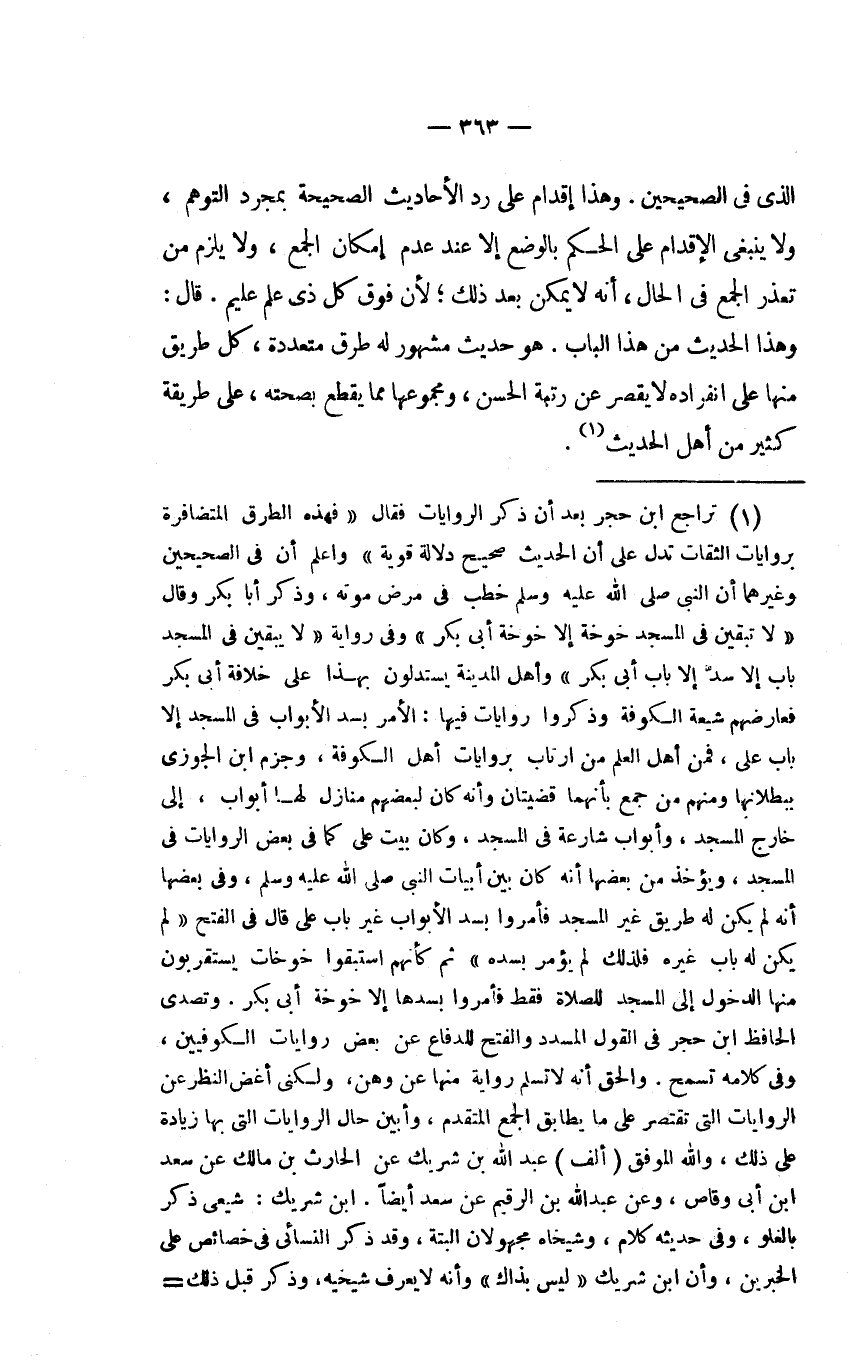 (1) تراجع ابن حجر بعد أن ذكر الروايات فقال (فهذه الطرق المتضافرة بروايات الثقات تدل على أن الحديث صحيح دلالة قوية) وأعلم أن في الصحيحين وغيرهما إِنَّ النَّبِيَّ صَلَّى اللَّهُ عليه وسلم خطب في مرض موته، وذكر أبا بكر وقال (لا تبقين في المسجد خوخة إلا خوخة أبا بكر) وفي رواية (لا يبقين في المسجد باب إلا سد إلا باب أبي بكر) وأهل المدينة يستدلون بهذا على خلافة أبي بكر فعارضهم شيعة الكوفة وذكروا روايات فيها: الأمر بسد الأبوب في المسجد إلا باب علي، فمن أهل العلم من ارتاب بروايات أهل الكوفة، وجزم ابن الجوزي ببطلانها ومنهم من جمع بأنهما قضيتان وأنه كان لبعضهم منازل لها أبواب، إلى خارج المسجد، وأبواب شارعة في المسجد، كان بيت علي كما في بعض الروايات في المسجد، ويؤخذ من بعضها أنه كانت بين أبيات النبي صلى الله عليه وسلم، وفي بعضها أنه لم يكن له طريق غير المسجد فأمروا بسد الأبواب غير باب علي قال في الفتح (لم يكن له باب غيره فلذلك لم يؤمر بسده) ثم كأنهم استبقوا خوخات يستقربون منها الدخول إلى المسجد للصلاة فقط فأمروا بسدها إلا خوخة أبي بكر. وتصدى الحافظ ابن حجر في القول المسدد والفتح للدفاع عن بعض روايات الكوفيين، وفي كلامه تسمح. والحق أنه لا تسلم رواية منها عن وهن، ولكني أغض النظر عن الروايات التي تقتصر على ما يطابق الجمع المتقدم، وأبين حال الروايات التي بها زيادة على ذلك، والله الموفق (ا) عبد الله بن شريك عن الحارث بن مالك عن سعد ابن أبي وقاص، وعن عبد الله بن الرقيم عن سعد أيضاً. ابن شريك: شيعي ذكر بالغلو، وفي حديثه كلام، وشيخاه مجهولان البتة، وقد ذكر النسائي في خضائص علي الخبرين، وأن ابن شريك (ليس بذاك) وأنه لا يعرف شيخيه، وذكر قبل ذلك=
