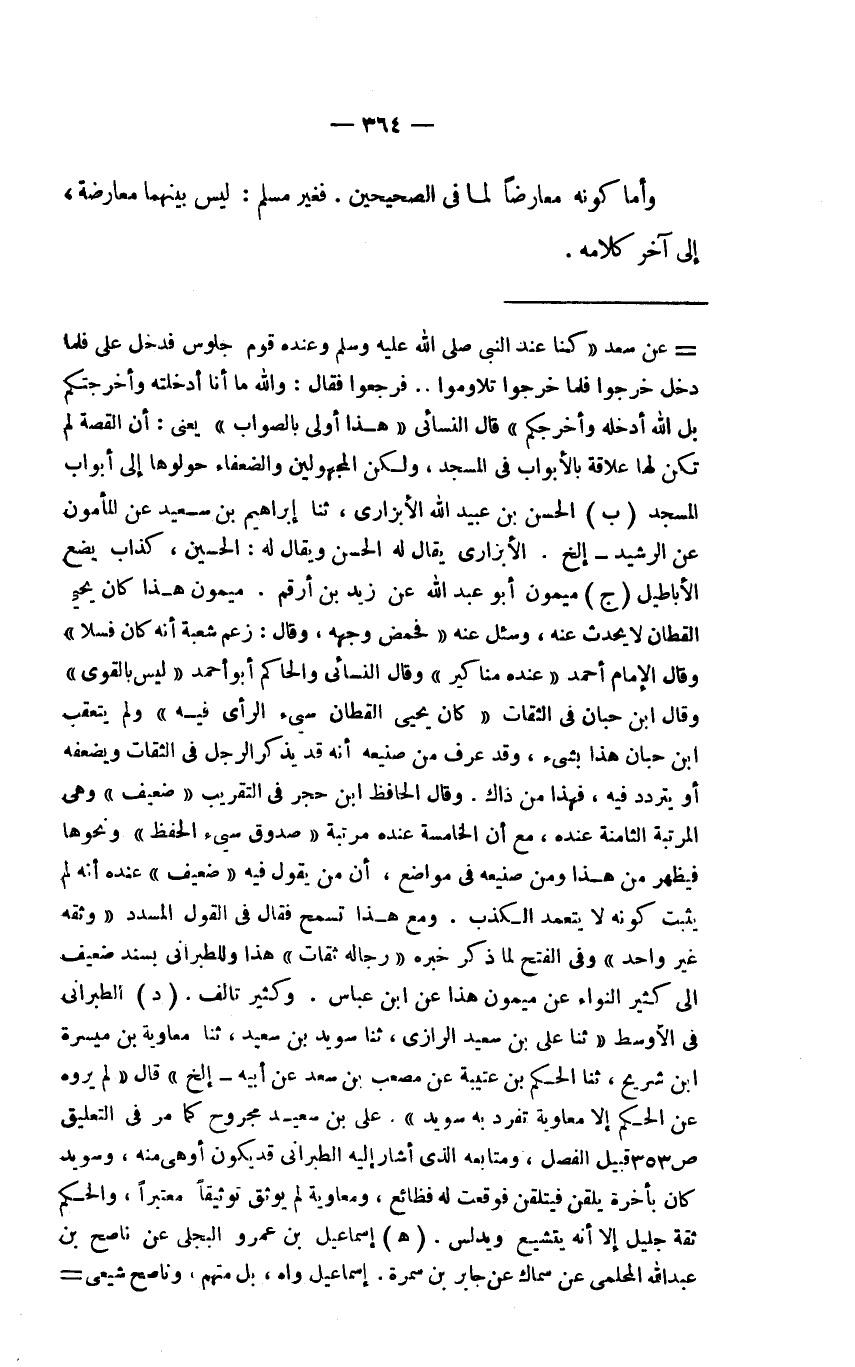 = عن سعد (كُنَّا عِنْدَ النَّبِيِّ صَلَّى اللَّهُ عليه وسلم وعنده قوم جلوس فدخل علي فلما دخل خرجوا فلما خرجوا تلاوموا.. فرجعوا فقال: والله ما أنا أدخلته وأخرجتكم بل الله أدخله وأخرجكم) قال النسائي (هذا أولى بالصواب) يعني: أن القصة لم تكن لها علاقة بالأبواب في المسجد، ولكن المجهولين والضعفاء حولوها إلى أبواب المسجد (ب) الحسن بن عبيد الله الأبزاري، ثنا إبراهيم عن سعيد عن المأمون عن رشيد إلخ. الأبزاري يقال له الحسن ويقال له: الحسين، كذاب يضع الأباطيل (ج) ميمون أبو عبد الله عن زيد بن أرقم. ميمون هذا كان يحيى القطان لا يحدث عنه، وسئل عنه (فحمض وجهه، وقال: زعم شعبة أنه كان فسلاً) وقال الإمام أحمد (عنده مناكير) وقال النسائي والحاكم أبو أحمد (ليس بالقوي) وقال ابن حبان في الثقات (كان يحيى القطان سيء الرأي فيه) ولم يتعقب ابن حبان هذا بشيء، وقد عرف من صنيعه أنه قد يذكر الرجل في الثقات ويضعفه أو يتردد فيه، فهذا من ذاك. وقال الحافظ ابن حجر في التقريب (ضعيف) وهي المرتبة الثامنة عنده، مع أن الخامسة عنده مرتبة (صدوق سيء الحفظ) ونحوها فيظهر من هذا ومن صنيعه في مواضع، أن من يقول فيه (ضعيف) عنده أنه لم يثبت كونه لا يتعمد الكذب. ومع هذا تسمح فقال في القول المسدد (وثقة غير واحد) وفي الفتح لما ذكر خبره (رجاله ثقات) هذا وللطبراني بسند ضعيف إلى كثير النواء عن ميمون هذا عن ابن عباس. وكثير تالف. (د) الطبراني في الأوسط (ثنا علي بن سعيد الرازي، ثنا سويد بن سعيد، ثنا معاوية بن ميسرة ابن شريح، ثنا الحكم بن عتيبة عن مصعب بن سعد عن أبيه إلخ) قال (لم يروه عن الحكم إلا معاوية تفرد به سويد) علي بن سعيد مجروح كما مر في التعليق ص 353 قبيل الفصل، ومتابعه الذي أشار إليها الطبراني قد يكون أوهى منه، وسويد كان بآخره يلقن فيتلقن فوقعت له فظائع، ومعاوية لم يوثق توثيقاً معتبراً، والحكم ثقة جليل إلا أنه يتشيع ويدلس. (?) إسماعيل بن عمرو البجلي عن ناصح بن عبد الله المحلمي عن سماك عن جابر بن سمرة. إسماعيل واه، بل متهم، وناصح شيعي=