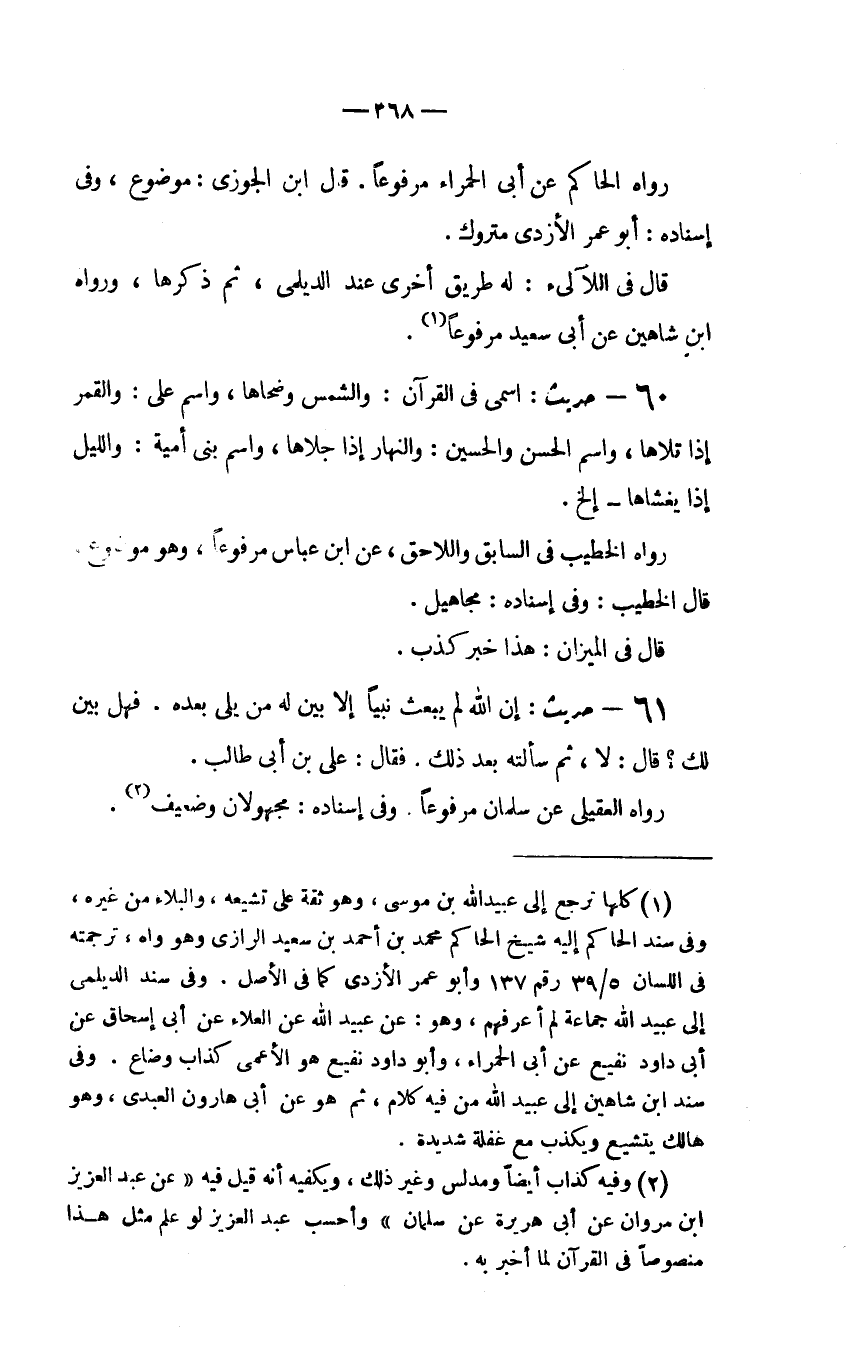 (2) وفيه كذاب أيضاً ومدلس وغير ذلك، ويكفيه أنه قيل فيه (عن عبد العزبز ابن مروان عن أبي هريرة عن سلمان) وأحسب عبد العزيز لو علم مثل هذا منصوصاً في القرآن لما أخبر به.