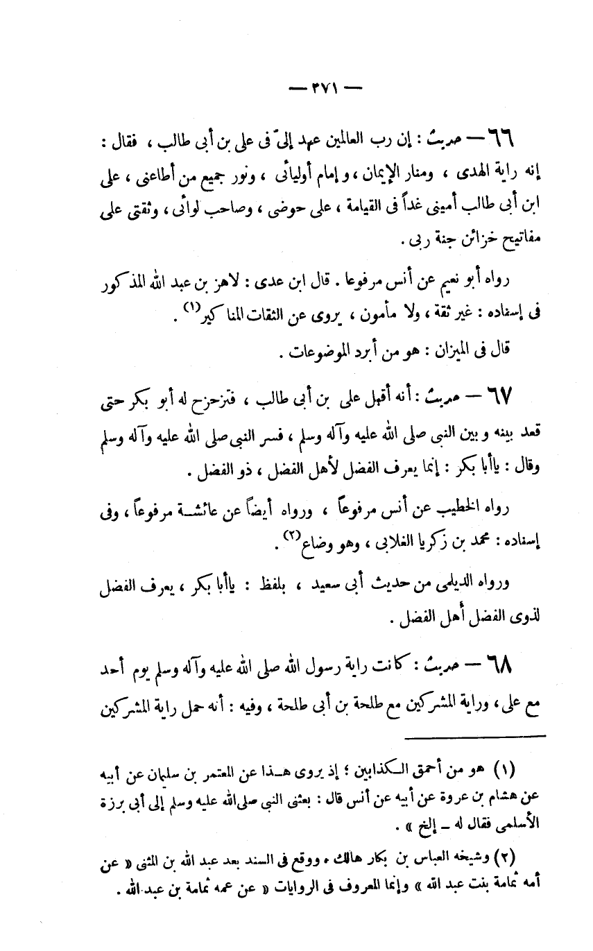 67 - حديث: "إِنَّ رَبَّ الْعَالَمِينَ عَهِدَ إِلَيَّ فِي عَلِيِّ بْنِ أَبِي طَالِبٍ، فَقَالَ: إِنَّهُ رَايَةُ الْهُدَى، وَمَنَارُ الإِيمَانِ، وَإِمَامُ أَوْلِيَائِي، وَنُورُ جَمِيعِ من أطاعني، علي ابن أَبِي طَالِبٍ أَمِينِي غَدًا فِي القيامة، على حَوْضِي، وَصَاحِبُ لِوَائِي، وَثِقَتِي عَلَى مَفَاتِيحِ خَزَائِنِ جَنَّةِ رَبِّي".
