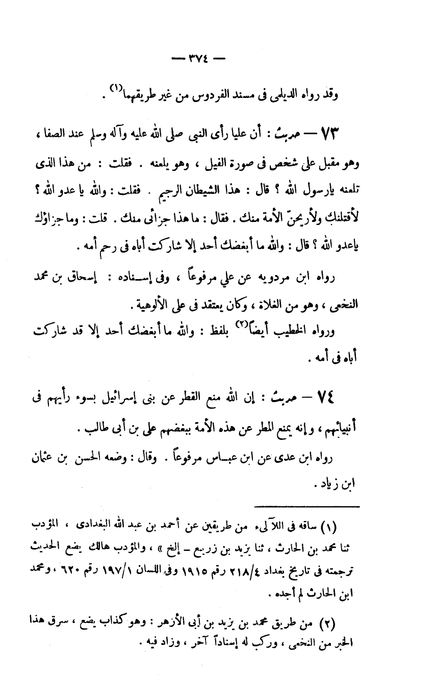 74 - حديث: "إِنَّ عَلِيًّا رَأَى النَّبِيَّ صَلَّى اللَّهُ عَلَيْهِ وَآلِهِ وَسَلَّمَ عِنْدَ الصَّفَا، وَهُوَ مُقْبِلٌ عَلَى شَخْصٍ فِي صُورَةِ الْفِيلِ، وَهُوَ يَلْعَنُهُ. فَقُلْتُ: مَنْ هَذَا الَّذِي تَلْعَنُهُ يَا رَسُولَ اللَّهِ؟ قَالَ: هَذَا الشَّيْطَانُ الرَّجِيمُ. فَقُلْتُ: وَاللَّهِ يَا عَدُوَّ اللَّهِ؟ لأَقْتُلَنَّكَ وَلأُرِيحَنَّ الأُمَّةَ مِنْكَ. فَقَالَ: مَا هَذَا جَزَائِي مِنْكَ. قُلْتُ: وَمَا جَزَاؤُكَ يَا عَدُوَّ اللَّهِ؟ قَالَ: وَاللَّهِ مَا أَبْغَضَكَ أَحَدٌ إِلا شَارَكْتُ أَبَاهُ فِي رَحِمِ أُمِّهِ".