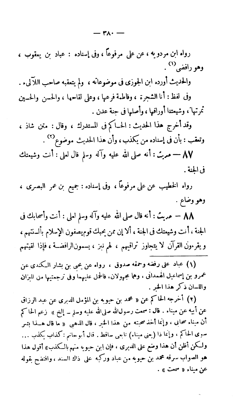 (1) عباد على رفضه وحمقه صدوق، رواه عن يحيى بن بشار الكندي عن عمرو بن إسماعيل الهمداني، وهما مجهولان، فالحمل عليهما وفي ترجمتيها من الميزان واللسان ذكر هذا الخبر.