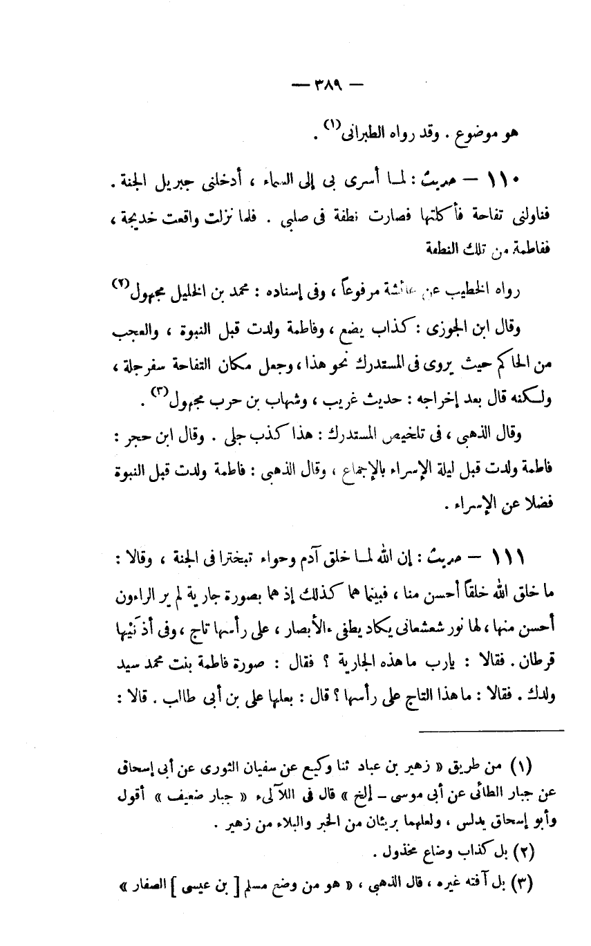 114 - حديث: "لَمَّا أُسْرِيَ بِي إِلَى السَّمَاءِ، أَدْخَلَنِي جِبْرِيلُ الْجَنَّةَ. فَنَاوَلَنِي تُفَّاحَةً فَأَكَلْتُهَا فَصَارَتْ نُطْفَةً فِي صُلْبِي. فَلَمَّا نَزَلْتُ وَاقَعْتُ خَدِيجَةَ، فَفَاطِمَةُ مِنْ تِلْكِ النُّطْفَةِ".