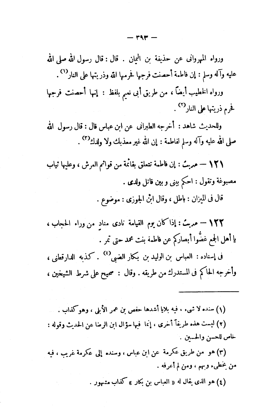 125 - حديث: "إِنَّ فَاطِمَةَ تَتَعَلَّقُ بِقَائِمَةٍ مِنْ قَوَائِمِ الْعَرْشِ، وَعَلَيْهَا ثِيَابٌ مَصْبُوغَةٌ وَتَقُولُ: احْكُمْ بَيْنِي وَبَيْنَ قَاتِلِ وَلَدِيَّ.