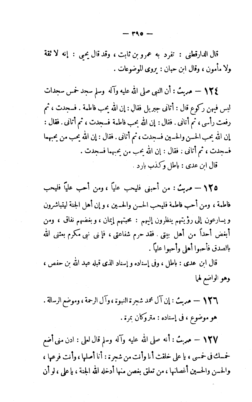 128 - حديث: "أَنَّ النَّبِيَّ صَلَّى اللَّهُ عَلَيْهِ وَآلِهِ وَسَلَّمَ سَجَدَ خَمْسَ سَجَدَاتٍ لَيْسَ فِيهِنَّ رُكُوعٌ قَالَ: أَتَانِي جِبْرِيلُ فَقَالَ: إِنَّ اللَّهَ يُحِبُّ فَاطِمَةَ. فَسَجَدْتُ، ثُمَّ رَفَعْتُ رَأْسِي، ثُمَّ أَتَانَي. فَقَالَ: إِنَّ اللَّهَ يُحِبُّ فَاطِمَةَ فَسَجَدْتُ، ثُمَّ أَتَانِي. فَقَالَ: إِنَّ اللَّهَ يُحِبُّ الْحَسَنَ وَالْحُسَيْنَ فَسَجَدْتُ، ثُمَّ أَتَانِي. فَقَالَ: إِنَّ اللَّهَ يُحِبُّ مَنْ يُحِبُّهُمَا فَسَجَدْتُ، ثُمَّ أَتَانِي: فَقَالَ: إِنَّ اللَّهَ يُحِبُّ مَنْ يُحِبُّهُمَا فَسَجَدْتُ.