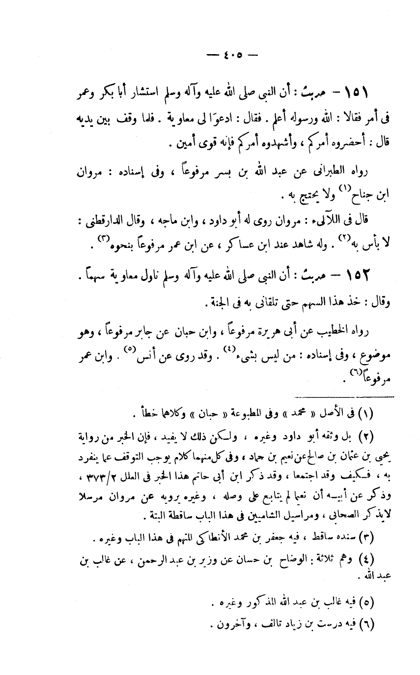 (2) بل وثقه أبو داود وغيره، ولكن ذلك لا يفيد، فإن الخبر من رواية يحيى بن عثمان بن صالح عن نعيم بن حماد، وفي كل منهما كلام يوجب التوقف عما ينفرد به، فكيف وقد اجتمعا، وقد ذكر ابن أبي حاتم هذا الخبر في العلل 2/373، وذكر عن أبيه أن نعيماً لم يتابع على وصله، وغيره يرويه عن مروان مرسلاً لا يذكر الصحابي، ومراسيل الشاميين في هذا الباب ساقطة البتة.